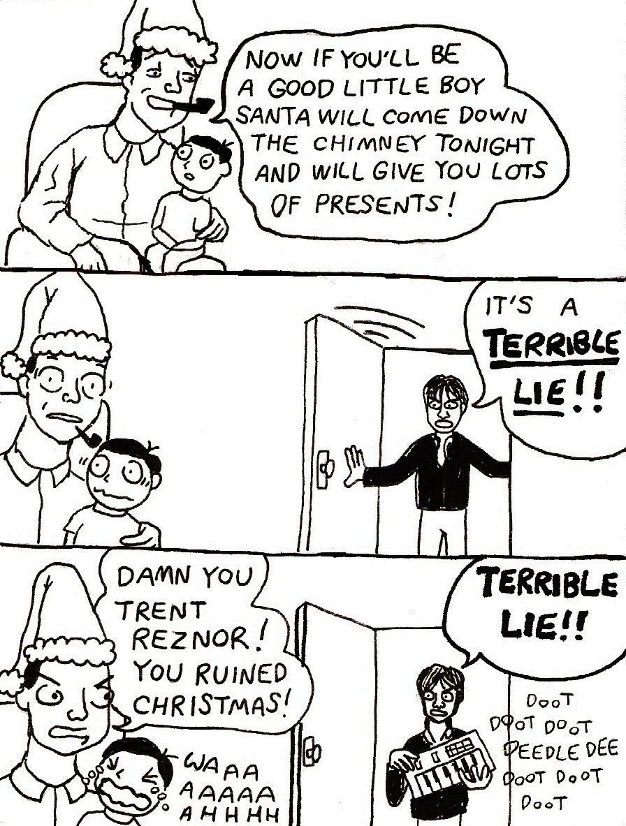 Il ne suffisait pas à Nine Inch Nails de désormais être un logo que Disney s'offrait pour signer la musique de Tron: Ares (voir notre chronique) : voilà que Head Like A Hole est désormais (presque) un chant de Noël ! Allez savoir ce qui, dans Pretty Hate Machine, évoque tant les cadeaux et le sapin : vous connaissez probablement déjà cette blague qui circule sur internet où l'on voit Trent Reznor gâcher Noël en entonnant Terrible Lie ?