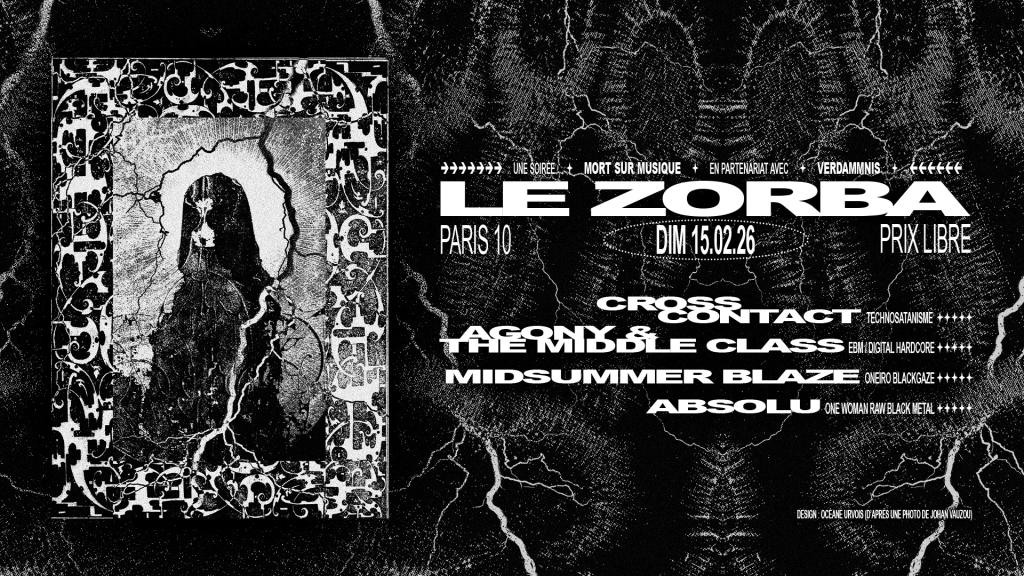 Alors là, c'est sûr, ça va faire mal. Le sous-sol du Zorba (Paris) sera le théâtre d'une soirée aussi sombre qu'intense, entre assauts électro / indus et black metal méchant. En partenariat avec Mort sur Musique, qui organise la soirée, nous avons la "joie" de vous recommander très fortement d'aller vous enterrer en compagnie de Cross Contact (black metal industriel), Agony & the Middle Class (digital hardcore / cyberpunk), Midsummer Blaze (blackgaze) et Absolu (black metal) le temps d'une soirée à prix libre mais conscient. Rendez-vous le 15 février.