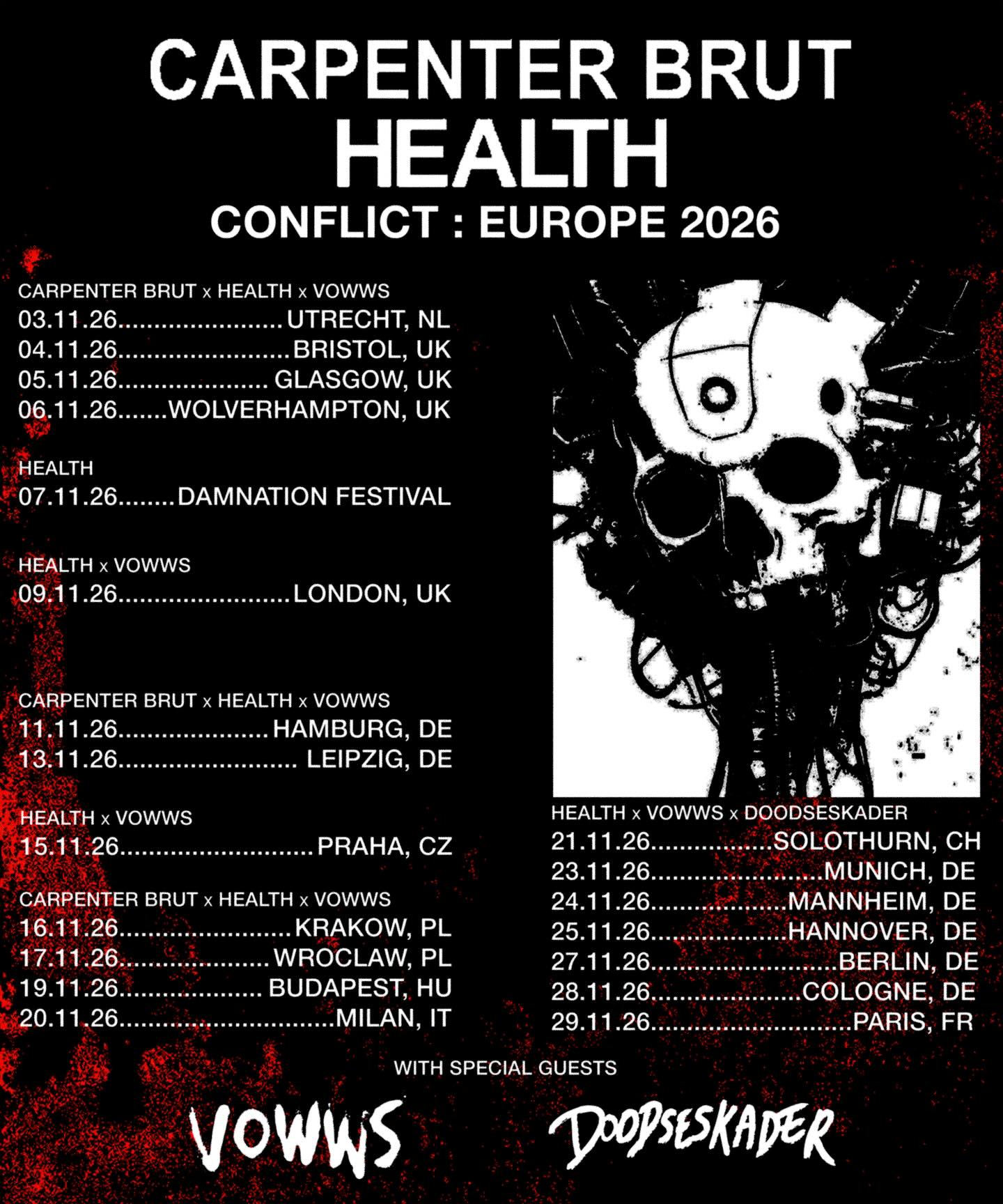 Oulala, cette affiche a de l'allure ! HEALTH traversera l'Europe tout novembre 2026. Selon les dates, le trio californien metal indus / shoegaze participera l'affiche avec Carpenter Brut, VOWWS et Doodseskader. Ce sont d'ailleurs ces deux derniers qui assureront la première partie de l'unique date française, au Bataclan (Paris) le 29 novembre.