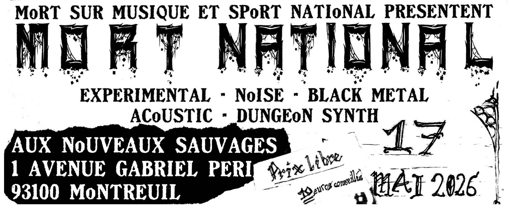 Mort National, c'est le petit nom donné par Mort sur Musique (à qui l'ont doit plein de super soirées bien sombres et décloisonnées comme on aime) et Sport National à la journée de ténèbres qui s'abattra sur Montreuil le 17 mai. La programmation, éclectique (du black metal, du piano, du violon, de l'électro..), nous fera passer par plusieurs supplices atypiques tout au long de la journée, de 14h à minuit aux Nouveaux Sauvages.