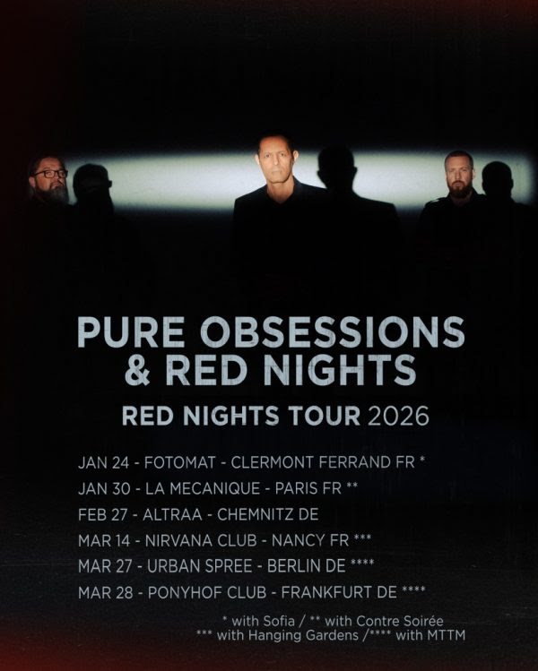 Pure Obsessions & Red Nights se lance dans une petite tournée entre la France et l'Allemagne (toutes les dates sont sur le flyer plus bas). De ce côté de la frontière, rendez-vous à Clermont-Ferrand (Fotomat) le 24 janvier, à Paris (Mécanique Ondulatoire) le 30 et à Nancy (Nirvana Club) le 14 mars.