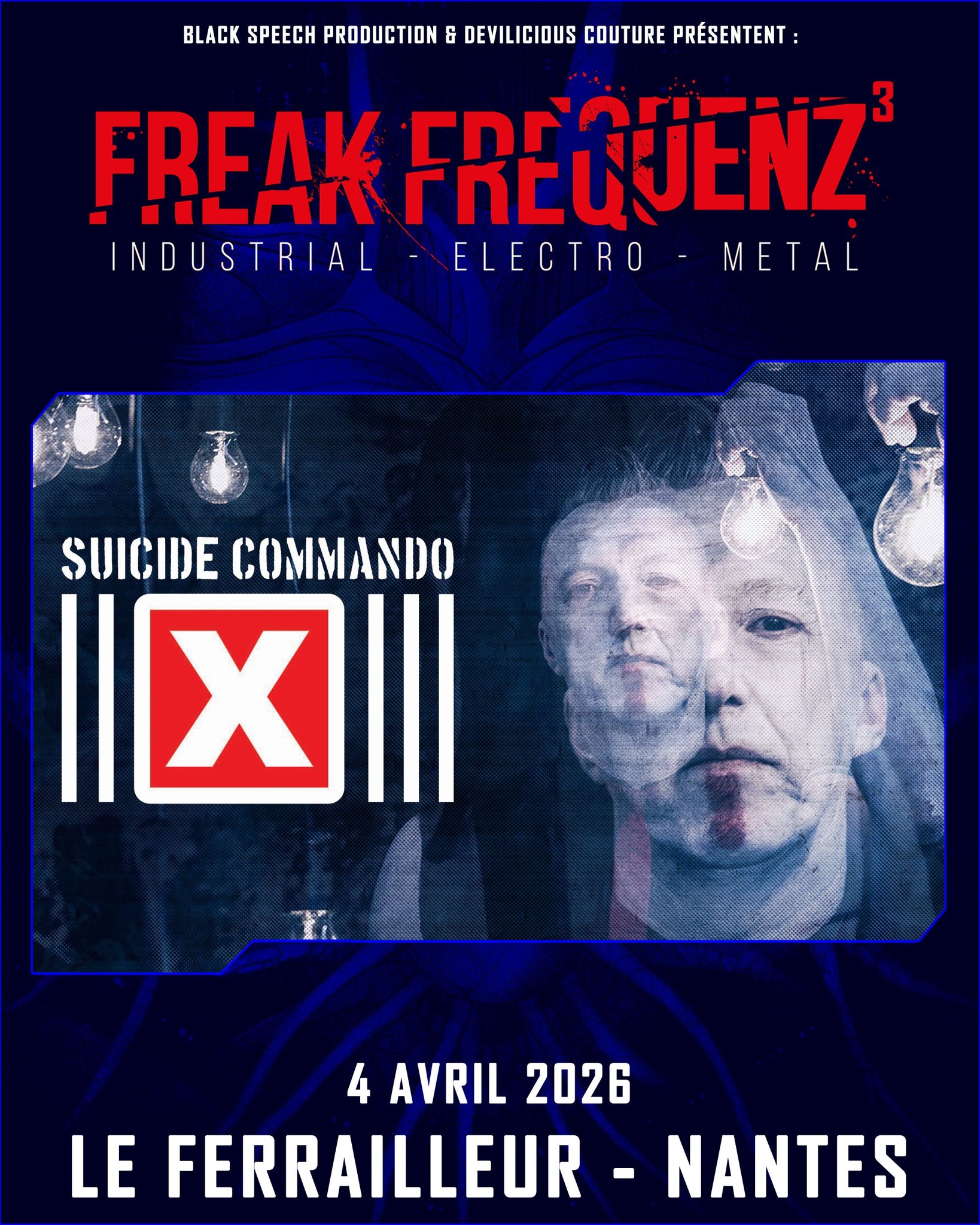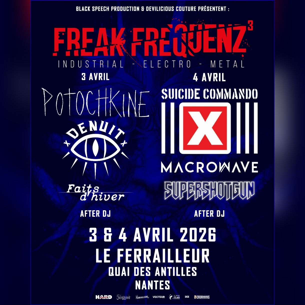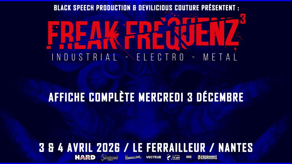 Le Freak Frequenz, petit festival dédié aux musiques gothiques et industrielles au Ferrailleur (Nantes) sera de retour pour une troisième édition les 3 et 4 avril prochain. Toujours organisé par Black Speech Production et Devilicious Couture, l'événement prend cette fois-ci le parti de ne pas inclure de metal (les années précédentes avaient vu se succéder Megaherz, Combichrist, Psyclon Nine ou encore Horskh) pour laisser toute la place à de la darkwave, cold wave, darksynth ou encore aggrotech.
