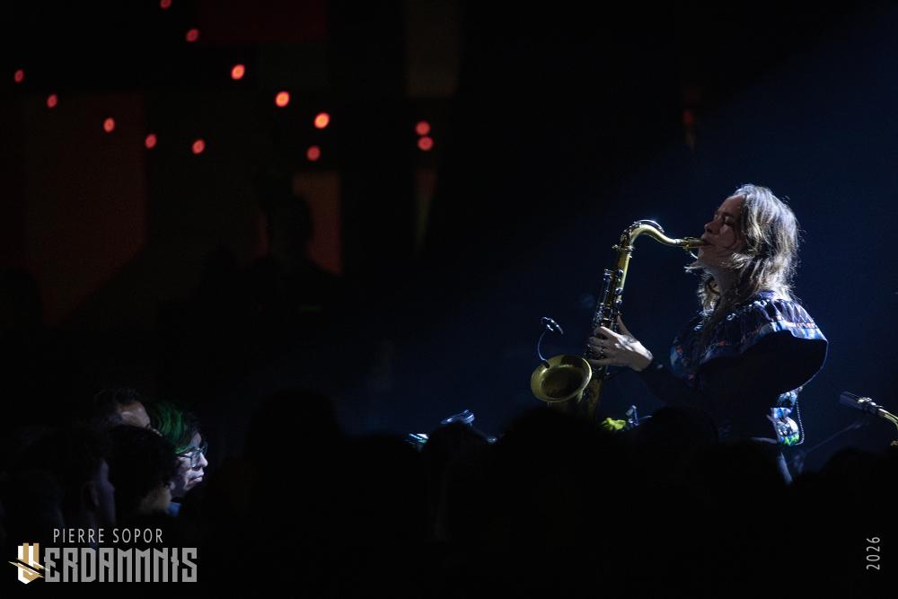 Lorsque la lumière s'éteint et que retentit à nouveau le saxophone, toutefois, Lisen Rylander Löve est de nouveau sur scène mais elle n'est plus seule : autour du projecteur qui l'illumine, on distingue les autres musiciens et derrière elle, la petite silhouette blonde d'Anna von Hausswolff qui se tient à côté de son orgue ; c'est en effet le saxophone de Lisen qui se charge de l'introduire par Consensual Neglect, bel instrumental au milieu de l'album Iconoclasts. Anna commence ensuite à chanter, puissante et sereine, et c'est l'éclosion : guitariste, claviériste et batteur s'animent à leur tour sous les lumières, on reconnaît le morceau en forme de lente ascension Facing The Atlas. Ce n'était qu'un prélude, un échauffement, car cette douce ascension finie, le concert s'envole sur les morceaux suivants tirés du dernier album : le vibrant The Mouth finit par une brusque accélération furieuse où la batterie s'en donne à cœur joie, plus chaotique qu'en studio, tandis qu'Anna von Hausswolff ne tient visiblement plus en place, sautant en tous sens avec une énergie communicative ; le morceau-fleuve The Iconoclast nous la montre passant du déchaînement à la sérénité retrouvée avec une puissance imparable dans ses envolées aigües ; même la ballade The Whole Woman, qui sur l'album était en duo avec Iggy Pop, ne nous sort pas de cette énergie, la conviction qu'y met Anna et la force tranquille du rythme y pourvoient. On le voit, les nouveaux morceaux avec leur orientation étonnamment pop ont une belle puissance en live, emplis d'une énergie libératoire.