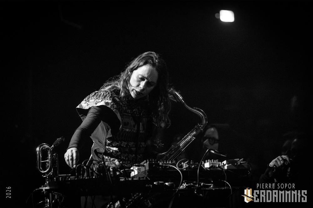 Dans la pénombre, avec son saxophone, elle impose un climat de film noir, mystérieux et opaque. Peut-être difficile à appréhender en studio en raison de son éclectisme, sa musique trouve en live une unité et une cohérence qui facilitent l'immersion. Il n'est pas encore 20h mais c'est comme si on était coincés dans un bar perdu hors du temps depuis plusieurs nuits déjà. Sa voix nous parvient à travers d'épaisses couches de filtres, sorte d'appel fantomatique hanté par des spectres de Beth Gibbons. Son jazz sombre est traversé de nappes électroniques, de drones menaçants, d'expérimentations mutantes qu'elle mène seule sur scène. L'écoute est, déjà, religieuse : le public sait ce qu'il est venu voir et sait que ce n'est pas le genre de concert où l'on retire son tee-shirt pour le faire tournoyer au-dessus de sa tête. Quelques mauvaises langues craignaient de s'ennuyer poliment mais Lisen Rylander Löve sait capter l'attention et nous piéger dans sa pénombre. On peut cependant se demander si la proximité musicale avec la tête d'affiche n'est pas trop évidente... faut-il rester dans les mêmes esthétiques sonores ou chercher à surprendre ? A vous de vous faire votre opinion, mais les artistes sur scène ce soir partageaient ce don pour transformer le temps en rêveries. Un joli fil rouge commençait à se tisser dans l'obscurité puisque, quelques minutes plus tard, c'est à nouveau elle qui lancera le cérémoniel d'Anna von Hausswolff.