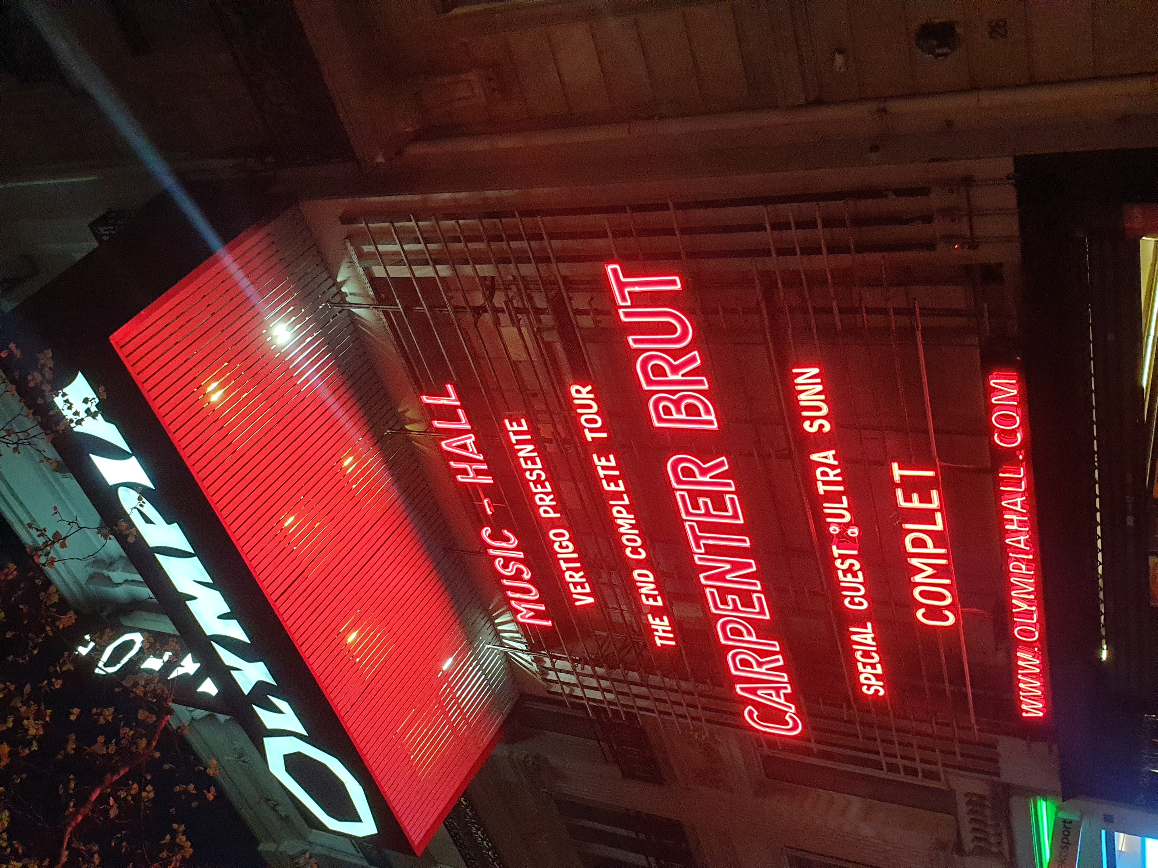 Les stars de la soirée étaient les nouveaux morceaux, leur côté dark electro futuriste qui dépoussièrent un peu les codes et ouvrent les horizons de Carpenter Brut sans pour autant renier sa patte, ce côté plus superlatif, plus mégalo, plus dans le gigantisme. Quand arrive Le Perv, on sait que la fin est proche. Jusque là, le concert était à l'image du dernier album en date : pas de chant. Alors quand Maniac vient conclure la soirée, c'est un peu une forme de libération : les gens peuvent brailler comme devant la pub Dash 2 en 1. Le sol tremble, les murs de l'Olympia tremblent mais sur scène, Franck, lui, ne tremble pas. Il garde ses lunettes, silhouette iconique, et reste cool comme le héros super balèze d'un film d'action à l'ancienne ou de la pub Mennen. Tout le monde sait que les mecs cools ça garde ses lunettes et ça ne se retourne pas pour regarder les explosions... tant pis pour lui, il a même pas vu LE FEU et les images cools sur les écrans dans son dos ! Enfin, l'explosion était aussi dans la fosse, où il pleuvait des jambes, des pompes et autres fringues.