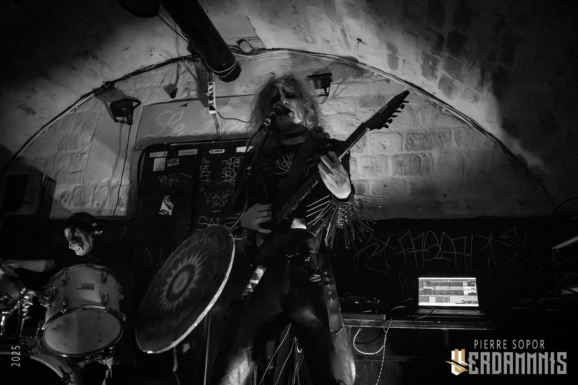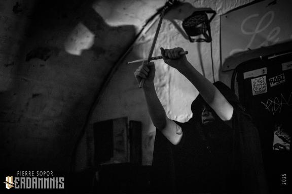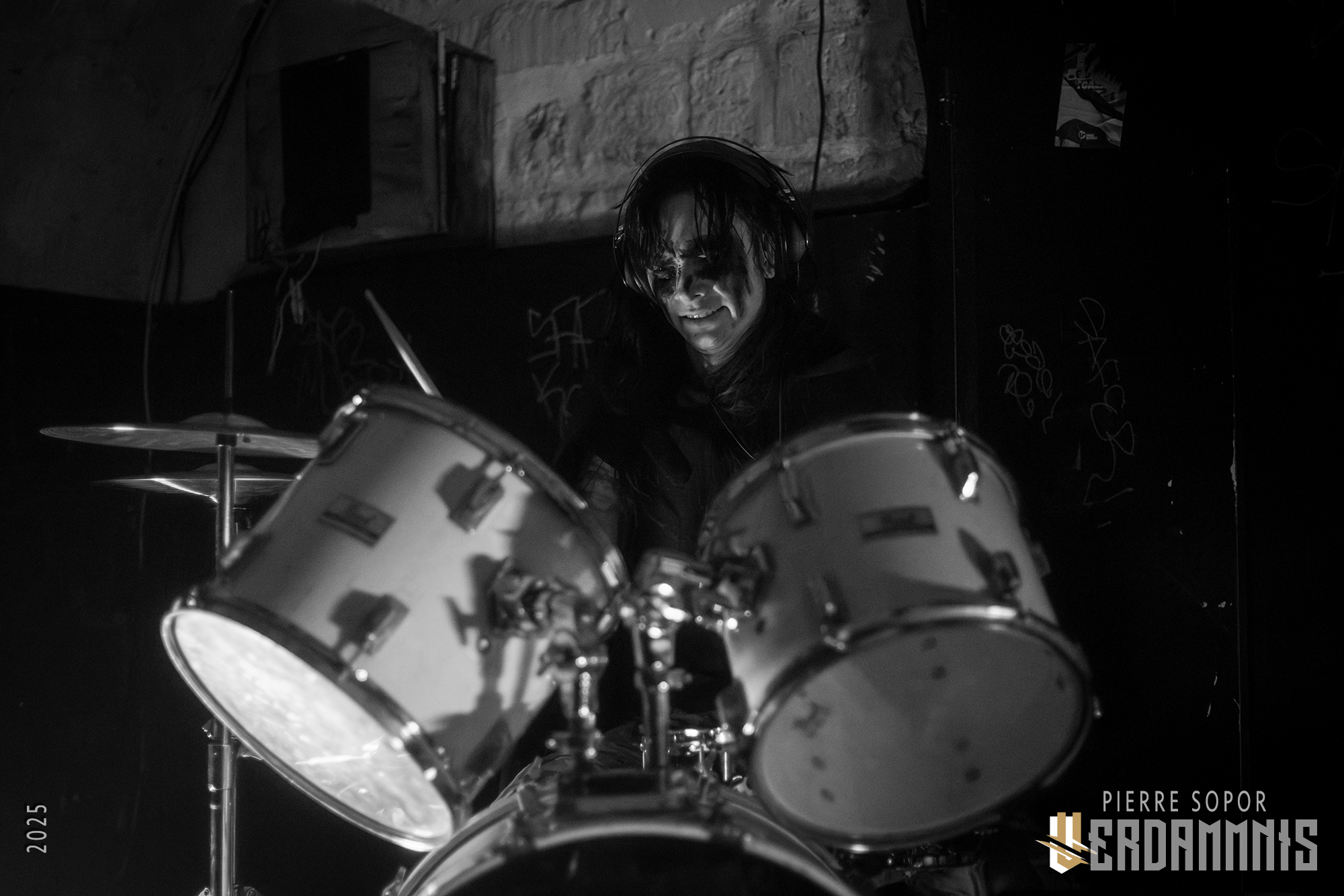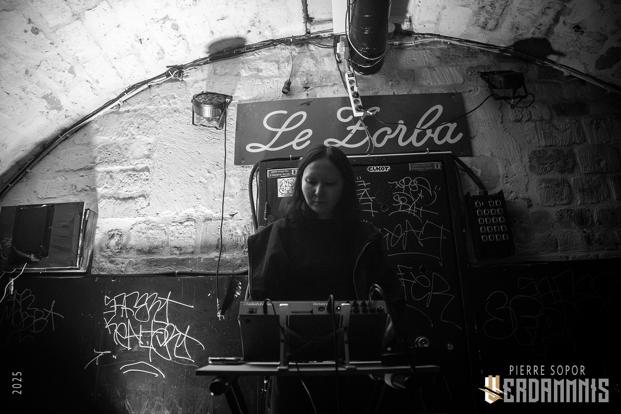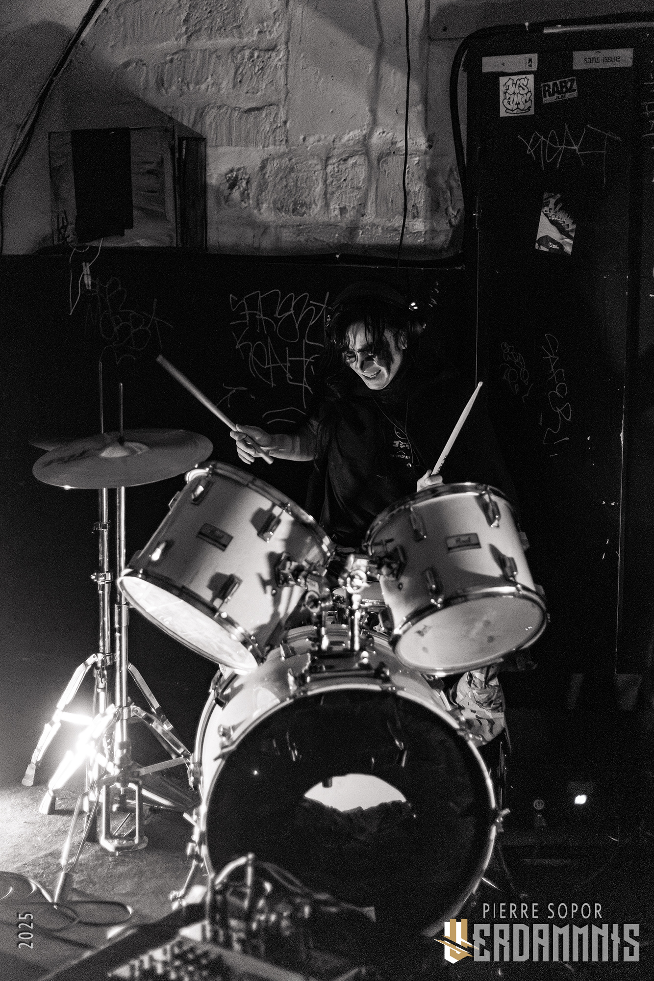 Vient alors le moment d'insister sur la configuration du Zorba, bar situé à Belleville et dont la petite salle est en sous-sol. Il est probable que les habitués du bar, qui peuvent suivre sur un écran les événements qui se déroulent sous leurs pieds, se soient posés quelques questions au début du concert d'Absolu. Du black metal brut de décoffrage, sans fioriture, crade, viscéral, méchant, un truc poisseux qui arrache les tympans et frotte les tripes avec du verre pillé. En studio, les démos d'Absolu sont dégueulasses, comme il se doit. En live, c'est dégueulasse. Néanmoins, quelques instants de poésie contemplative en voix claire viennent apporter du relief et une touche mélancolique à Absolu. Les mots sortent, le souffle court, et confèrent à cet exorcisme noir une forme de grâce mutante touchante. On sent que malgré le look qui respecte les codes du genre (corpse paint, plein de trucs qui piquent, etc) et un cérémoniel théâtral (Chère Pourrie, à la batterie, qui fait un crucifix inversé avec ses baguettes entre chaque morceau), Absolu s'est approprié le black metal pour en faire un condensé de mal-être personnel et intime. "C'est fini, le cimetière va fermer" : trainons encore un peu dans cette cave transformée en crypte le temps d'une soirée qui ne fait que commencer !