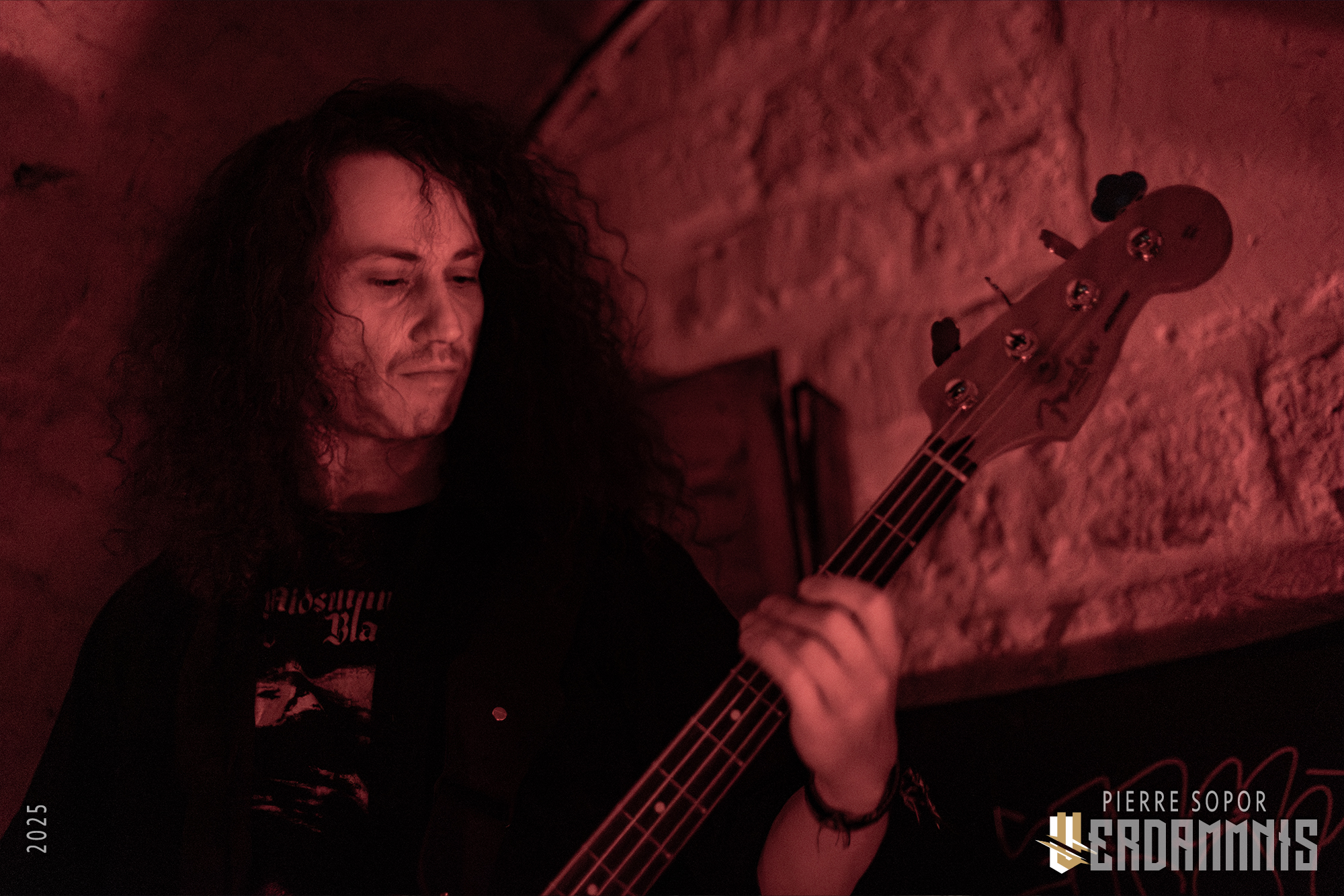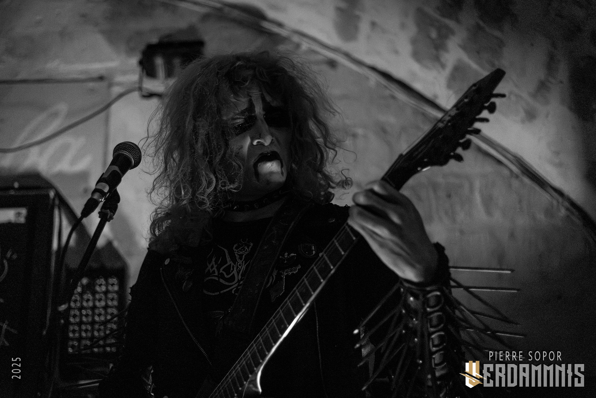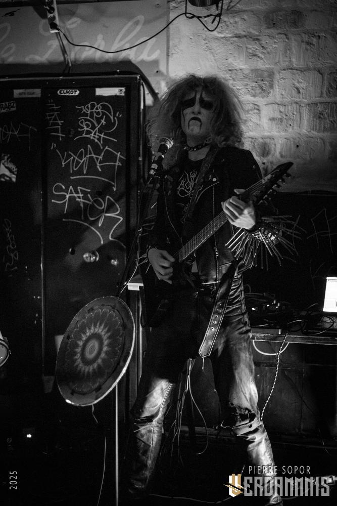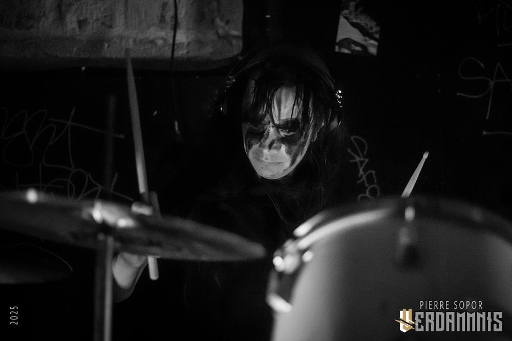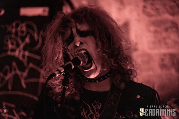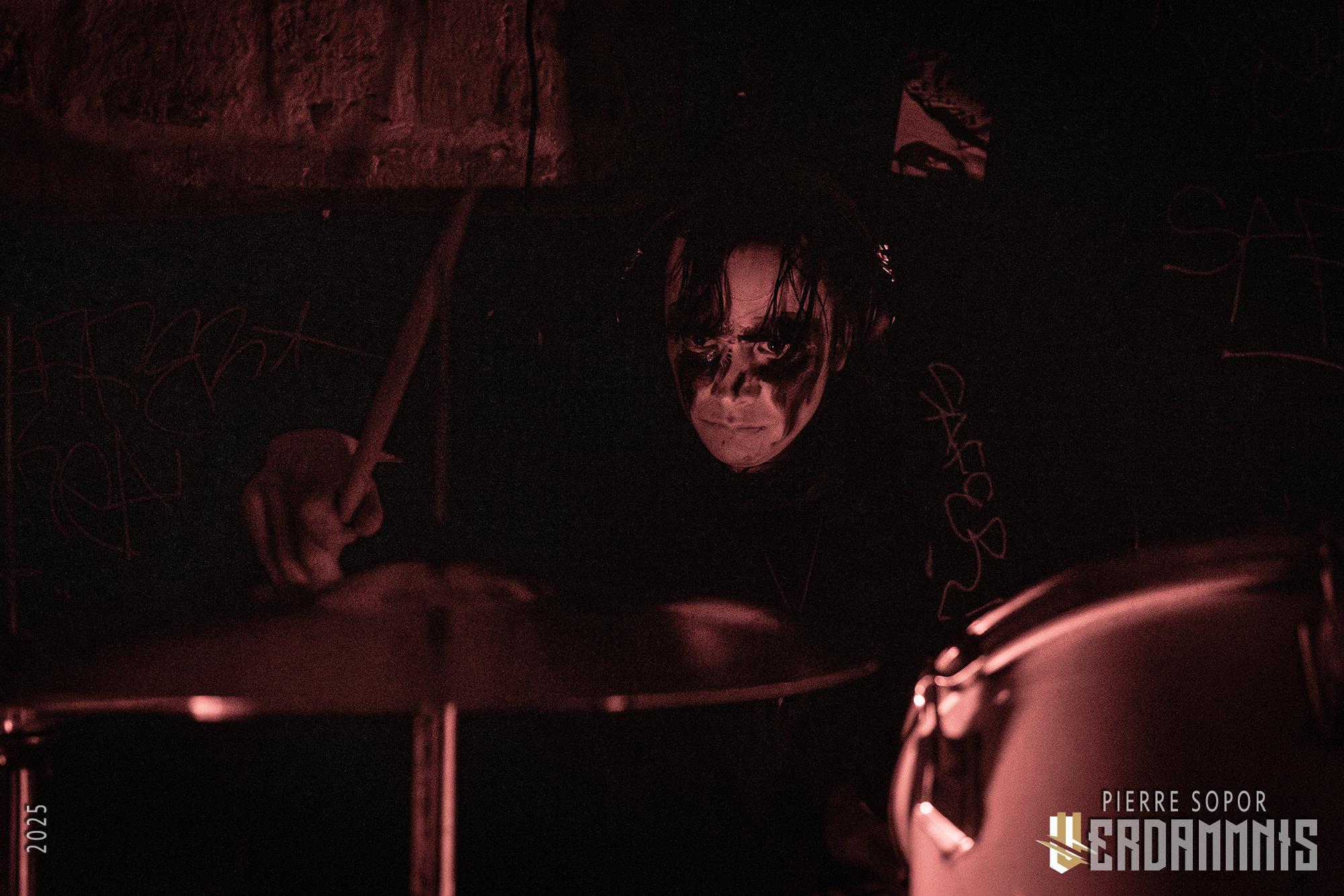 Vient alors le moment d'insister sur la configuration du Zorba, bar situé à Belleville et dont la petite salle est en sous-sol. Il est probable que les habitués du bar, qui peuvent suivre sur un écran les événements qui se déroulent sous leurs pieds, se soient posés quelques questions au début du concert d'Absolu. Du black metal brut de décoffrage, sans fioriture, crade, viscéral, méchant, un truc poisseux qui arrache les tympans et frotte les tripes avec du verre pillé. En studio, les démos d'Absolu sont dégueulasses, comme il se doit. En live, c'est dégueulasse. Néanmoins, quelques instants de poésie contemplative en voix claire viennent apporter du relief et une touche mélancolique à Absolu. Les mots sortent, le souffle court, et confèrent à cet exorcisme noir une forme de grâce mutante touchante. On sent que malgré le look qui respecte les codes du genre (corpse paint, plein de trucs qui piquent, etc) et un cérémoniel théâtral (Chère Pourrie, à la batterie, qui fait un crucifix inversé avec ses baguettes entre chaque morceau), Absolu s'est approprié le black metal pour en faire un condensé de mal-être personnel et intime. "C'est fini, le cimetière va fermer" : trainons encore un peu dans cette cave transformée en crypte le temps d'une soirée qui ne fait que commencer !