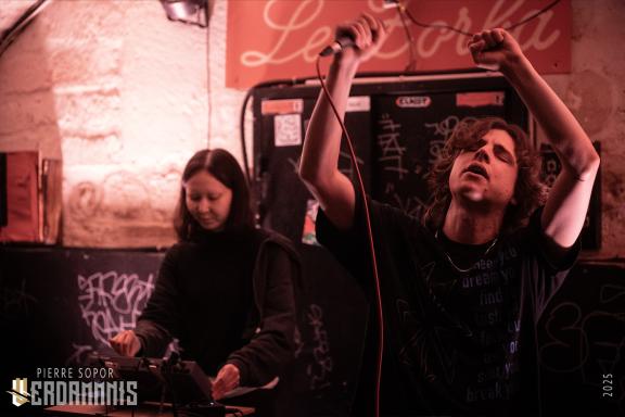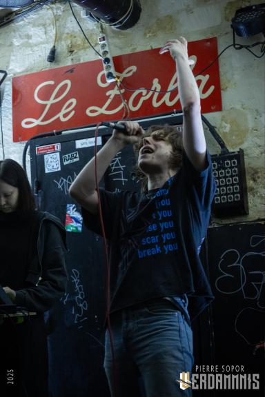 On vous dirait bien que sur scène, Agony & the Middle Class donne tout. Ce serait faux : ils donnent tout sur scène mais aussi dans le public, où ce diable intenable de chanteur passe la moitié de son temps, à convulser et remuer toutes les parties de son corps comme un possédé. Le contraste avec la présence spectrale de Dana amuse : c'est finalement un jeu de scène simple et sobre mais efficace. Oh, et en plus Agony & the Middle Class avait apporté des lumières : on n'y a rarement aussi bien vu au Zorba ! On s'est donc faits matraquer par les slogans rageurs incisifs, les samples empilés et catapultés dans un chaos sonore synthétique sauvage et jouissif. On a eu une pensée pour les gens au bar, en haut, qui ont dû se dire que la sono déconnait sévèrement. C'était cool. Après ça, Antoine demande, soucieux : "j'ai éternué à un moment, ça s'est vu ?". Mais non coco, tu remuais trop, c'est passé inaperçu et t'aurais pu faire ça dans le micro qu'on aurait tous cru que c'était les paroles habituelles. Va te prendre un bon grog, et la prochaine fois, on te veut en short !