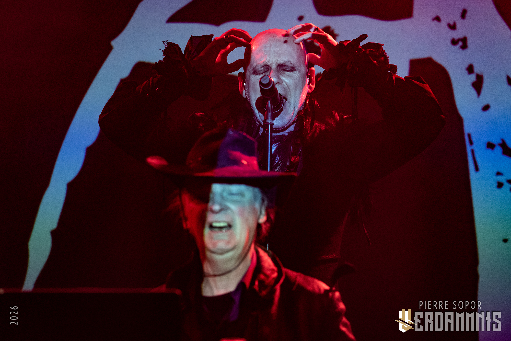 Changement d'ambiance avec The Arch, un groupe formé en 1986, une époque où les jeunots d'Unfarben n'étaient même pas encore des rêves. Au fil des décennies, leur new wave a emprunté à l'EBM aussi bien qu'au gothic rock. Les guitares grincent, les chauves sourient, surtout ce diable de Gerd Van Geel au chant qui profite au maximum de l'estrade en fond de scène pour soigner ses effets théâtraux. Son chant sensible et expressif évoque parfois celui de David Bowie, parfois celui de Peter Murphy, mais sa silhouette rôdant dans les ombres rappelle celle du Comte Orlock de Nosferatu, avec le supplément de glamour apporté par les plumes !