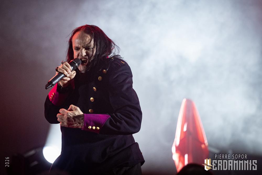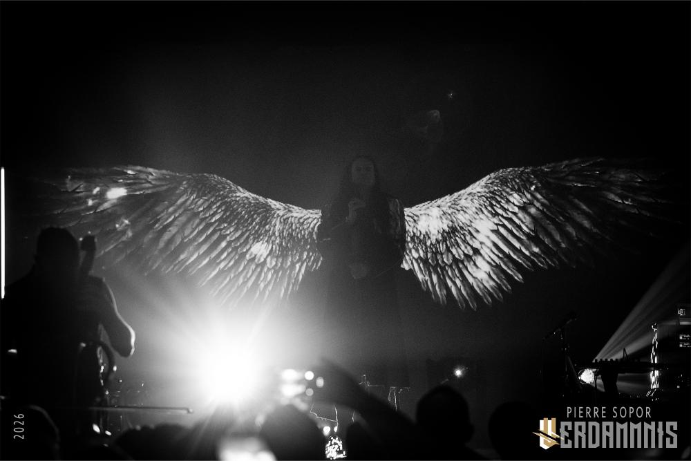 Le jeu de scène vient renforcer cette impression de théâtre baroque. Il y a bien sûr cet écran avec lequel le groupe joue, que ce soit quand Henke se place entre deux ailes d'ange ou quand les visages des musiciens sont captés en direct par le caméraman masqué pour ensuite être transformé sous nos yeux, mélangés à celui d'Elon Musk, mais également des accessoires : une cape, une poupée, des pages arrachées et dévorées, des structures métalliques frappées à coups de chaines pendant l'impressionnante Mit dem Wissem... Goethes Erben associe le spectacle à son propos, le grandiloquent aux tourments intérieurs. C'est intimidant, captivant et toujours sublime. Le propos se fait parfois social et politique, alors que des images de Trump, Poutine ou d'explosions nucléaires sont projetées, rendant les grimaces soudainement bien plus effrayantes. Le groupe passe de l'onirisme au réel avec poésie et subtilité, l'esthétisme sombre et torturé renvoyant au réel. Des héritiers de Goethe, peut-être, mais aussi du théâtre épique de Brecht ou des cauchemars expressionnistes de Lang, Murnau et Wiene !