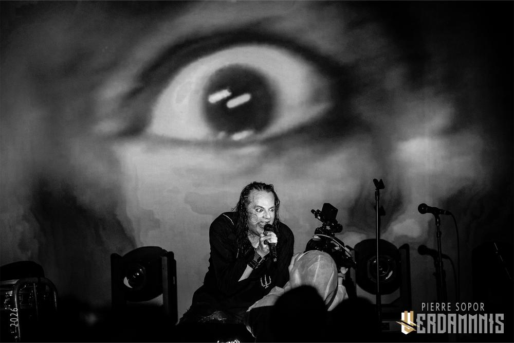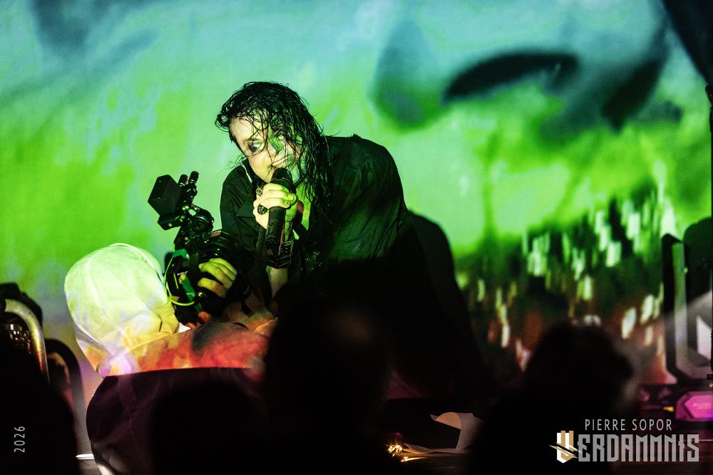 La soirée semble nous avoir préparés, petit à petit, à l'événement principal. Depuis que nous avons passé les portes du Black Lab, la musique a gagné en intensité et en théâtralité, Henke est même venu nous saluer en avance pendant Unfarben... L'excitation est palpable. On connaît la réputation scénique de Goethes Erben dont les concerts, à l'image de la musique, sont de véritables pièces de théâtre. Heureusement pour les plus impatients, le concert commence quelques minutes en avance, mettant fin à l'attente. Oswald Henke, accroupi en fond de scène, accompagné seulement d'un caméraman masqué, commence à déclamer son texte. Son visage est projeté en direct sur l'écran derrière lui, décuplant sa taille. Il semble nous fixer, son regard est noir, il nous apostrophe. On est immédiatement impliqués, captifs de ses mots.