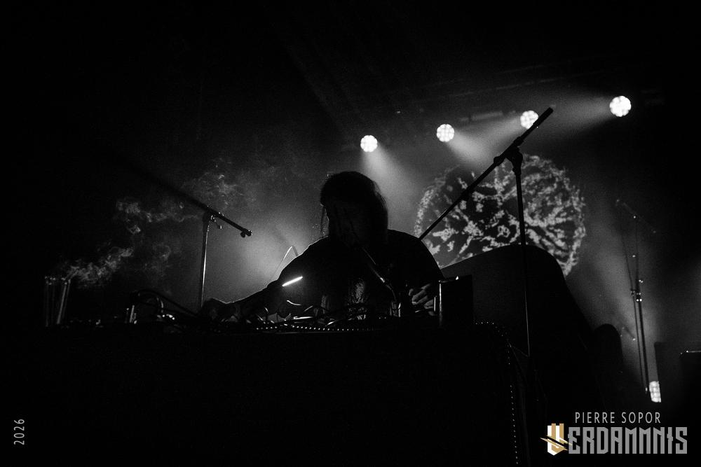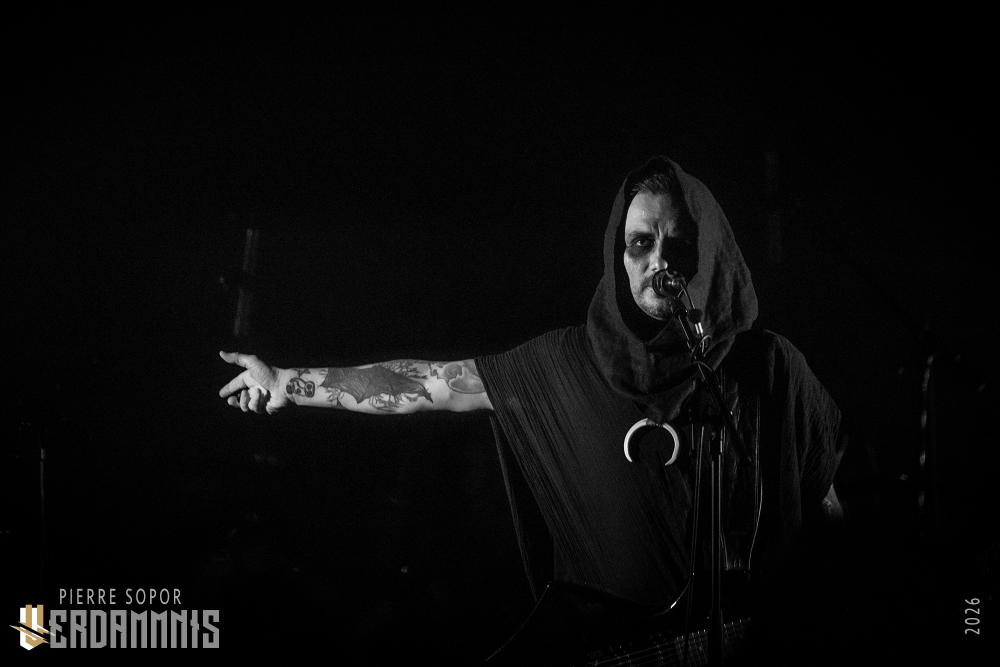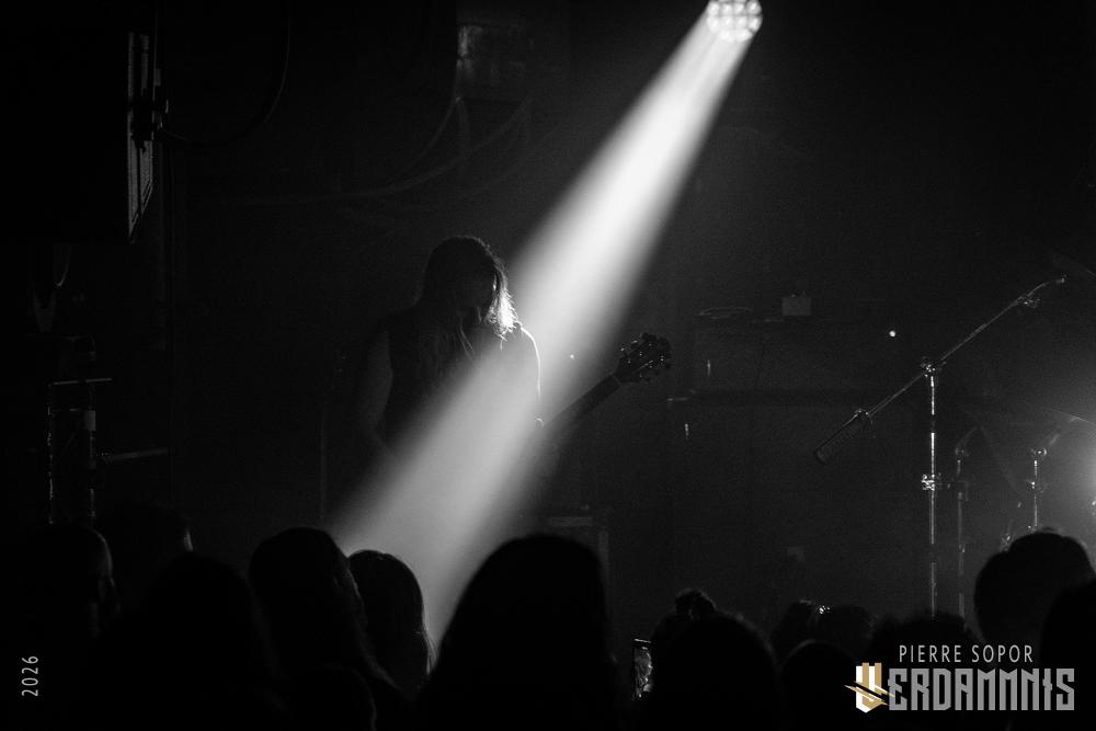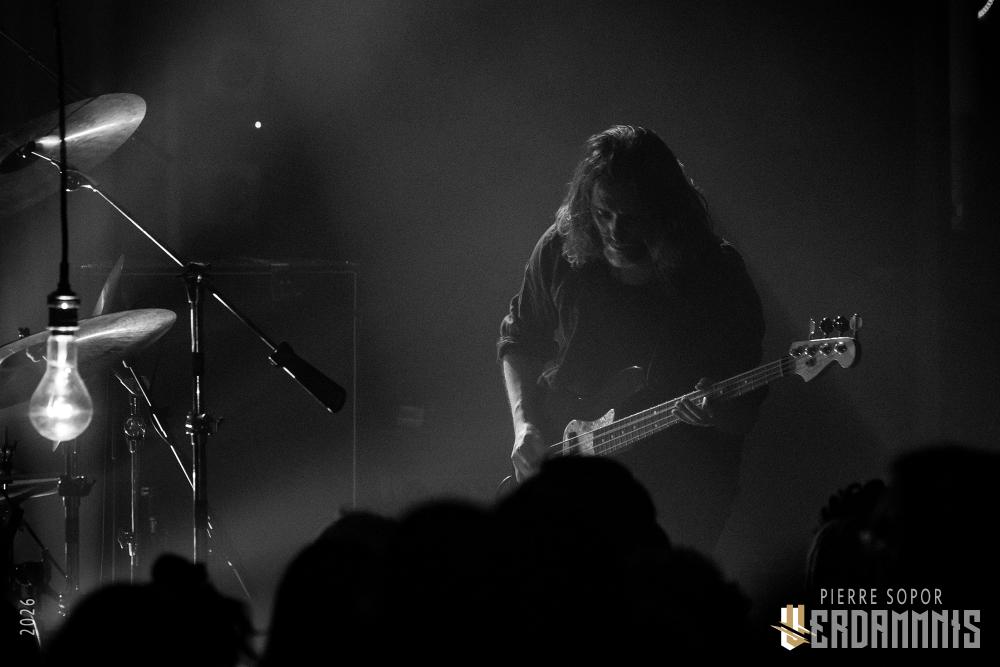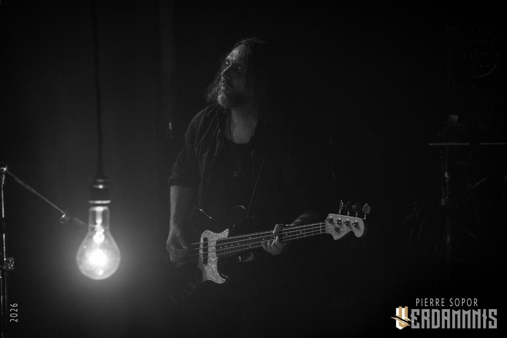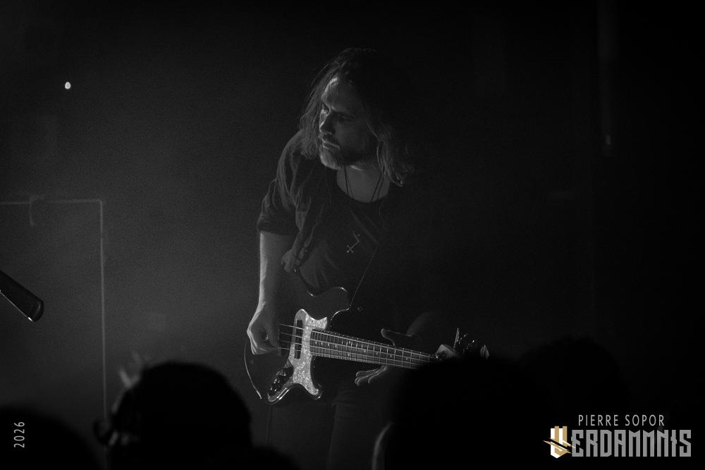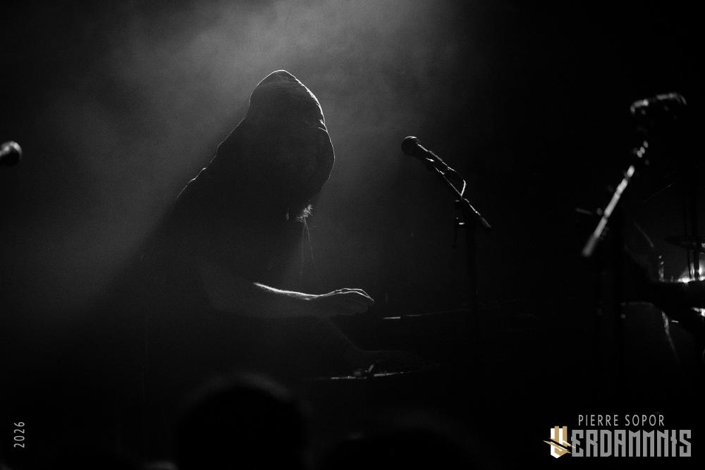 Pour être honnête, après le dernier passage de Hexvessel à Paris fin 2024 (live report), on avait peur de ne pas les revoir de si tôt au vu de la fréquentation pas folichonne. Ce soir, ça va mieux même si on sent que l'horaire tardif (le groupe commence après 22h) a eu raison de certains. Les silhouettes encapuchonnées prennent place sur scène, sans effusion. Hexvessel n'y va pas avec le dos de la cuillère pour casser l'ambiance : les mines sont maussades, le maquillage macabre, les yeux fermés ou tournés vers le sol... sauf ce diable de Ville Hakonen à la basse, on sent qu'il a trop envie de danser comme un fou et d'invoquer des trucs louches dans le noir. Pendant qu'il assure le show en grimaçant sous sa capuche et en prenant des poses marrantes, ses copains font semblant de pas le voir. On imagine alors le memo qui circule parmi les musiciens : "bon, on est super dark, on garde les capuches, on a l'air d'être en plein deuil... mais y'a Ville qui va faire le mariole alors ne le regardez pas trop sinon on va partir en fou rire et ça va finir en chenille avec les tee-shirts qui tournent au-dessus de la tête".