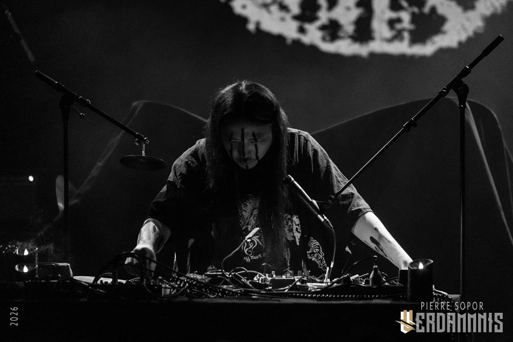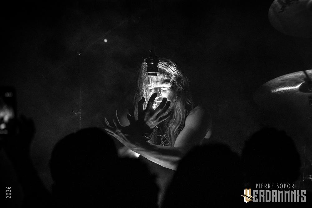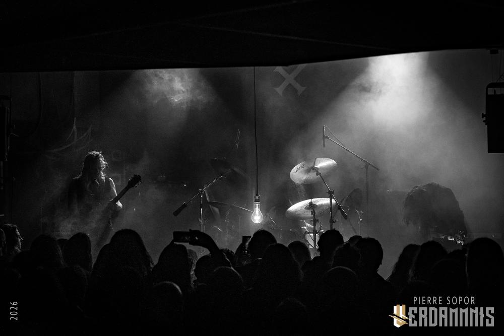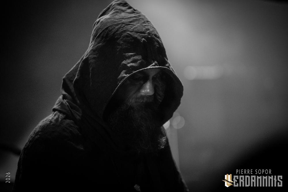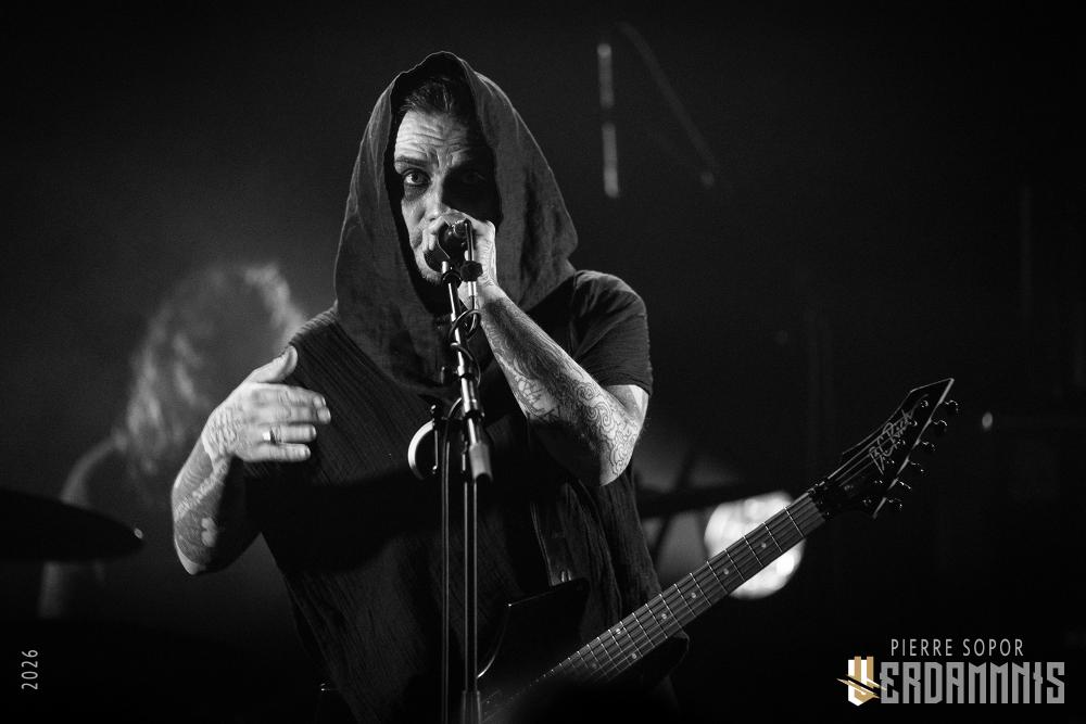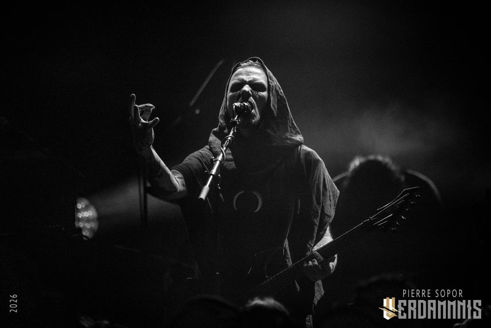Pour être honnête, après le dernier passage de Hexvessel à Paris fin 2024 (live report), on avait peur de ne pas les revoir de si tôt au vu de la fréquentation pas folichonne. Ce soir, ça va mieux même si on sent que l'horaire tardif (le groupe commence après 22h) a eu raison de certains. Les silhouettes encapuchonnées prennent place sur scène, sans effusion. Hexvessel n'y va pas avec le dos de la cuillère pour casser l'ambiance : les mines sont maussades, le maquillage macabre, les yeux fermés ou tournés vers le sol... sauf ce diable de Ville Hakonen à la basse, on sent qu'il a trop envie de danser comme un fou et d'invoquer des trucs louches dans le noir. Pendant qu'il assure le show en grimaçant sous sa capuche et en prenant des poses marrantes, ses copains font semblant de pas le voir. On imagine alors le memo qui circule parmi les musiciens : "bon, on est super dark, on garde les capuches, on a l'air d'être en plein deuil... mais y'a Ville qui va faire le mariole alors ne le regardez pas trop sinon on va partir en fou rire et ça va finir en chenille avec les tee-shirts qui tournent au-dessus de la tête".