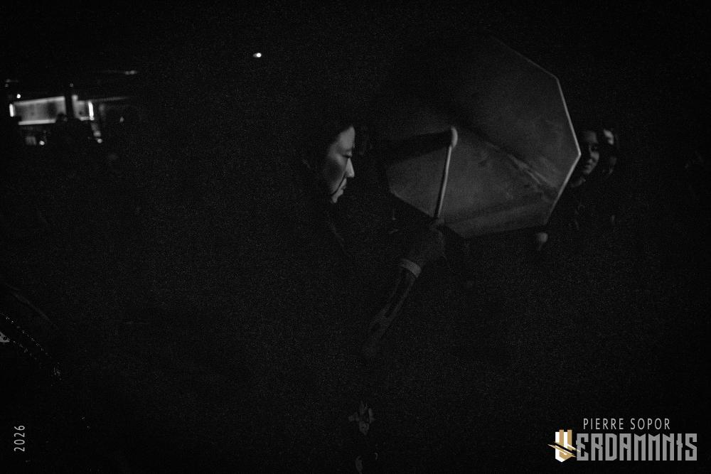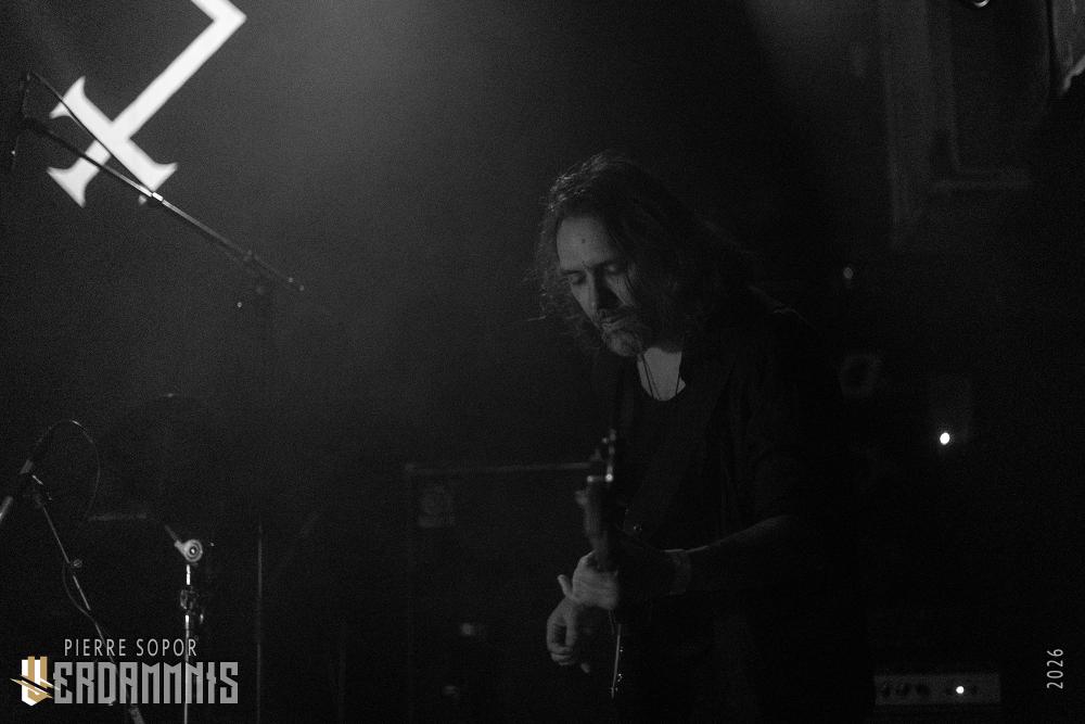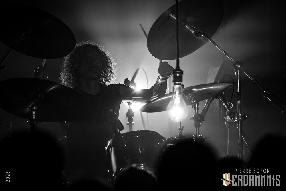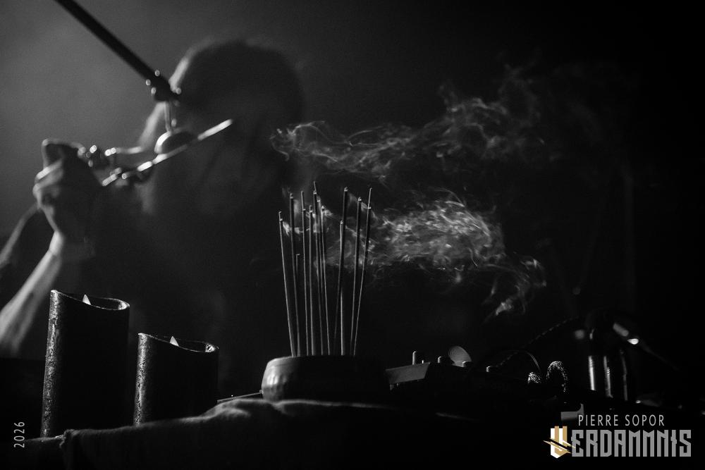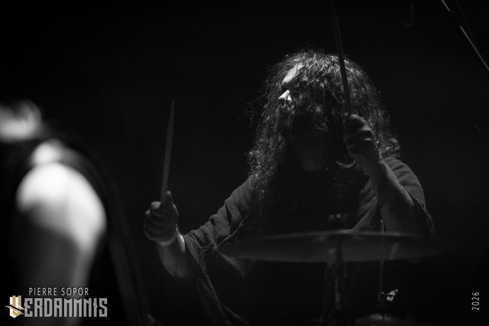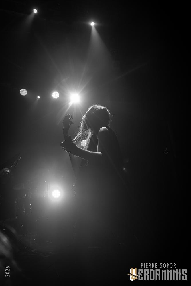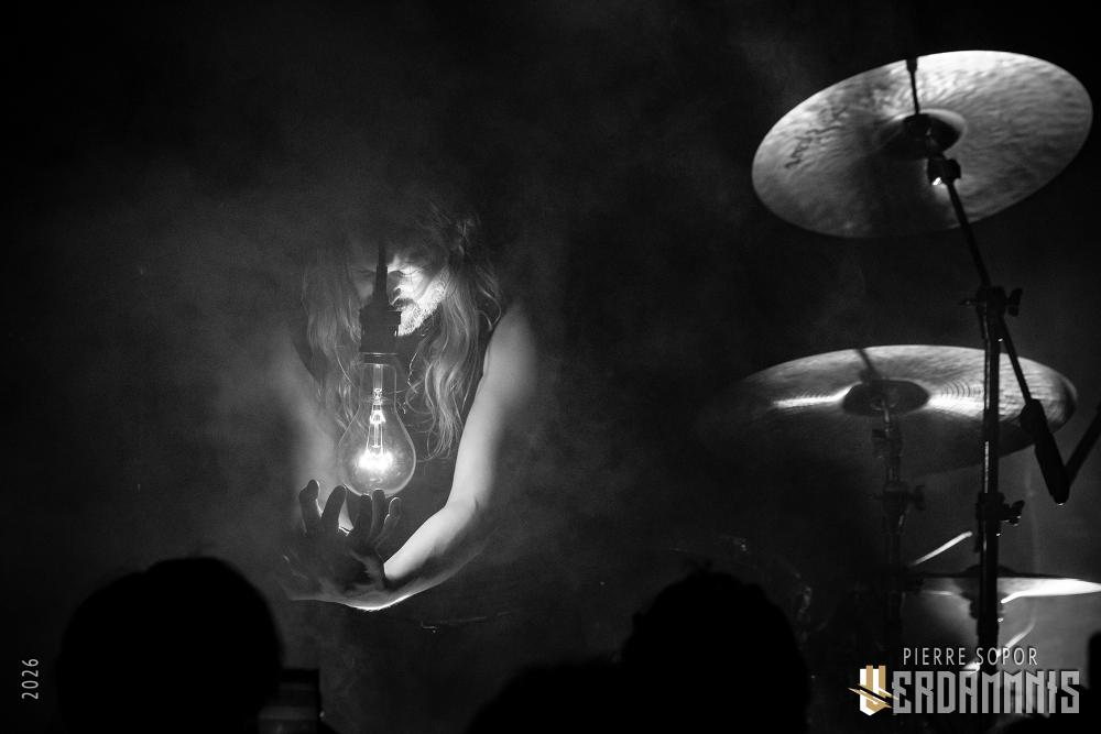 Pour être honnête, après le dernier passage de Hexvessel à Paris fin 2024 (live report), on avait peur de ne pas les revoir de si tôt au vu de la fréquentation pas folichonne. Ce soir, ça va mieux même si on sent que l'horaire tardif (le groupe commence après 22h) a eu raison de certains. Les silhouettes encapuchonnées prennent place sur scène, sans effusion. Hexvessel n'y va pas avec le dos de la cuillère pour casser l'ambiance : les mines sont maussades, le maquillage macabre, les yeux fermés ou tournés vers le sol... sauf ce diable de Ville Hakonen à la basse, on sent qu'il a trop envie de danser comme un fou et d'invoquer des trucs louches dans le noir. Pendant qu'il assure le show en grimaçant sous sa capuche et en prenant des poses marrantes, ses copains font semblant de pas le voir. On imagine alors le memo qui circule parmi les musiciens : "bon, on est super dark, on garde les capuches, on a l'air d'être en plein deuil... mais y'a Ville qui va faire le mariole alors ne le regardez pas trop sinon on va partir en fou rire et ça va finir en chenille avec les tee-shirts qui tournent au-dessus de la tête".