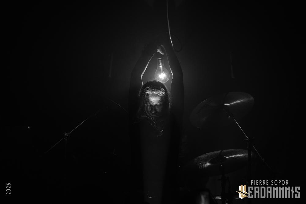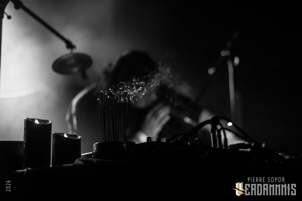 Fini les conneries, ça commence. Là encore, pas d'interruption et un set qui se vit comme un unique morceau vivant sa vie propre, échappant aux attentes, donnant parfois même l'impression que le groupe ne sait pas en avance où il va mener sa barque. On se laisse dériver alors. Guitares au boucles hypnotiques et batterie libre, les rythmiques partent dans tous les sens, imprévisibles. Il y a du rock sombre, un sens de l'occultisme qui sort tout droit des années 70, un peu de black metal, pas mal de jazz dans ce goût de la déconstruction, un peu de kraut rock, un peu de folie zeuhl à la Magma mais en plus dark...