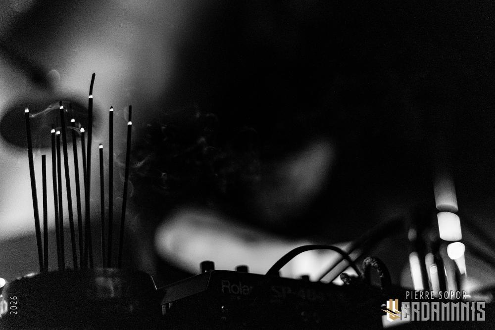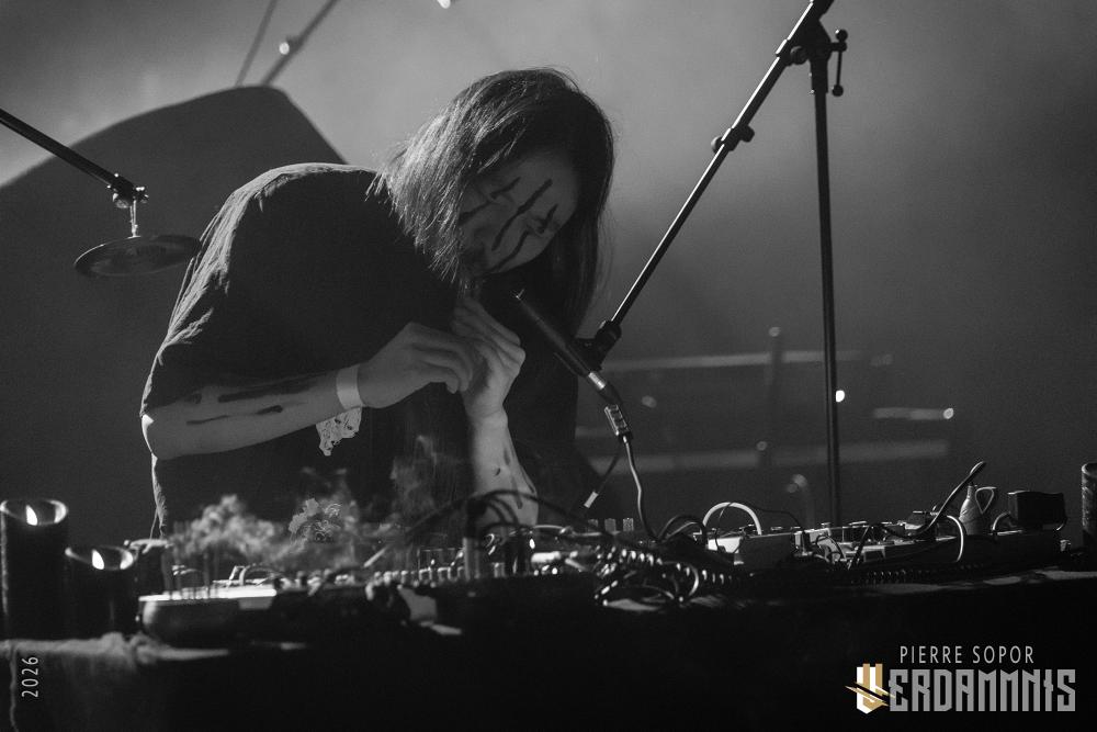 C'est parti pour un set sans interruption, une incantation drone / noise aux nombreux éléments organiques qui nous plongent dans un univers fait de machines modernes et de percussions ancestrales. La voix n'est qu'une nappe de plus qui s'ajoute aux différentes couches d'un son qui est aussi un brouillard, mutant parfois en borborygmes possédés. La répétition amène la transe et pose déjà le décor de la soirée. Il n'y aura aucune pause pendant cette cérémonie souvent obscure pleine de menaces primitives et de secrets cryptiques. L'artiste incarne tout cela, avec son maquillage et son jeu de scène parfois théâtral, faisant de son live une performance immersive fascinante. ruò tán prend le temps, à la fois parce que c'est sur la durée que se construisent ses créations, mais aussi parce qu'il s'en empare et le confisque, le privant de son sens, brouillant les repères et les époques. Cette musique-là tenait de l'invocation, ce que l'on a entendu était l'expression d'esprits dissimulés dans les ombres et convoqués le temps d'une soirée.