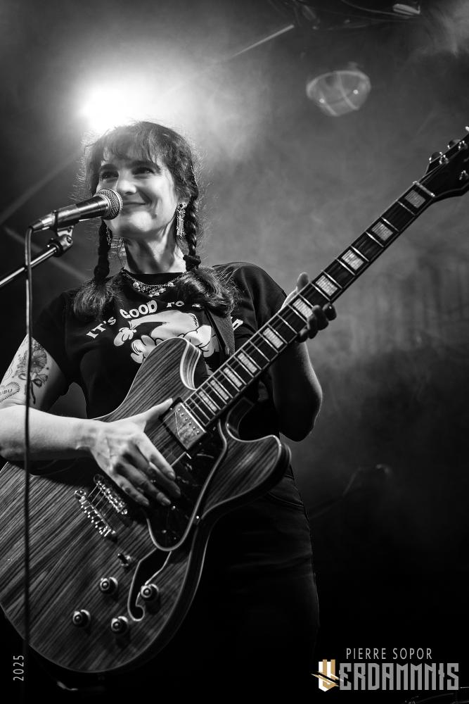 Oui, mais dans le public, ben y'avait même un peu de headbang. Sur du Léa Jacta Est. Et ça tapait dans les mains, ça agitait les verres de bière et tout : il faut croire que le public de Nuit Noire n'est pas le public black metal élitiste parisien que l'on imagine. Avant de retrouver l'icône des fées épée à la main, il y avait donc cet autre être un brin fantasmagorique, avec son pull du Grinch pour faire Noël, qui nous présente un mélange de titres de son premier album et de morceaux inédits. Une reprise d'Au Nom de la Rose et ses paroles douteuses, un morceau qui s'appelle Salive... et puis les "classiques" Horizons du Fantastique, avec son thérémine et ses OVNIS, Les Films pour Adulte ou Les Pyrénées. Humour macabre, tourments sincères, c'est aussi beau que ludique, Léa Jacta Est maîtrisant comme bien peu l'équilibre précaire entre les humeurs et se sortant avec élégance des pirouettes tonales les plus acrobatiques. Le concert avance, elle annonce que "la fin est proche". On est tristes parce qu'on sait qu'elle parle du concert, mais on se marre parce qu'on sait qu'elle parle aussi de la vie et du vrai monde. On a eu droit au Noël des Amis, ce monument des chansons de Noël et véritable earworm. "Petit Jésus est né et demain tout sera fermé, sauf nos cœurs avinés" : encore une fois, Léa Jacta Est a répandu des paillettes sur les tombes avec son ton unique et la grâce qui se dégage de cette improbabilité permanente. En plus, les métalleux ont aimé.