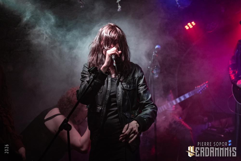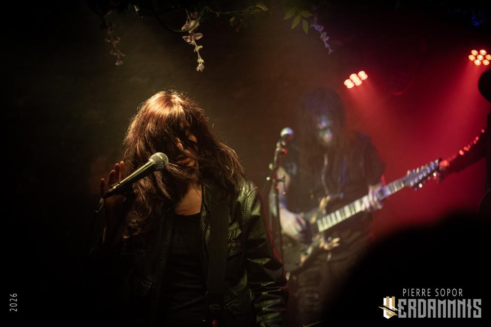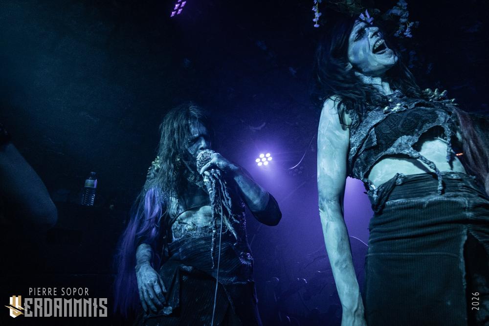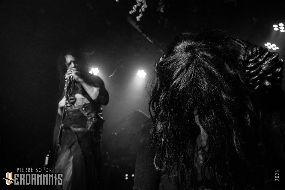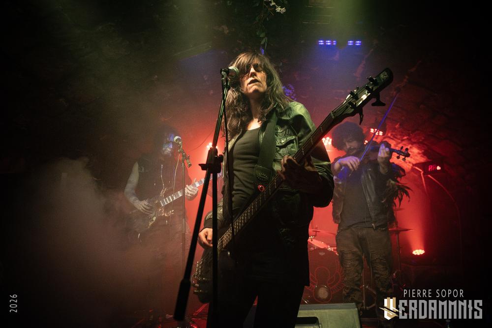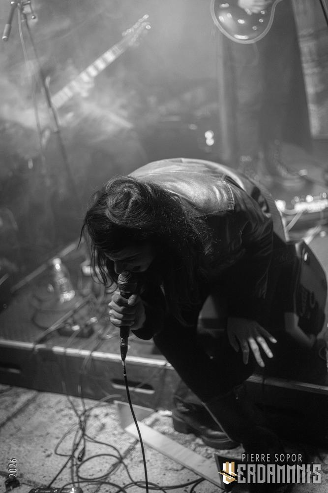 Rïcïnn est un monstre fascinant, une créature hybride qui interroge et émerveille. On est immédiatement soufflés par la puissance de la voix de Laure. A plusieurs reprises, elle s'adresse à Clémence, la plus iconique ingé son des souterrains parisiens et bassiste de Shaârghot, et lui demande un coup de main pour faire tenir son pied de micro mais très franchement, elle pourrait presque s'en passer tant sa voix résonne sur la pierre. Puis, c'est l'énergie de la musique qui nous happe. En live, Rïcïnn sonne bien plus rock, plus rentre-dedans, que les souvenirs que nous avions de ses deux albums (bien que Nereïd était parfois plus lourd et tendu). Son groupe assure, ça part dans tous les sens. Si nos regards se tournent évidemment souvent vers Laurent Lunoir en raison de son maquillage, à la présence monolithique, nos oreilles sont toutes chamboulées par un violon virtuose et théâtral complètement fou. En plus, le gars qui en joue a une veste ornée de plumes, ce dont personne ne parle, comme si c'était normal, comme si avoir des plumes sur son blouson était un truc banal. Dites-donc, les alternatifs parisiens, là, quand même, arrêtez de faire genre vous avez tout vu, un manteau à plumes, c'est un vrai sujet !