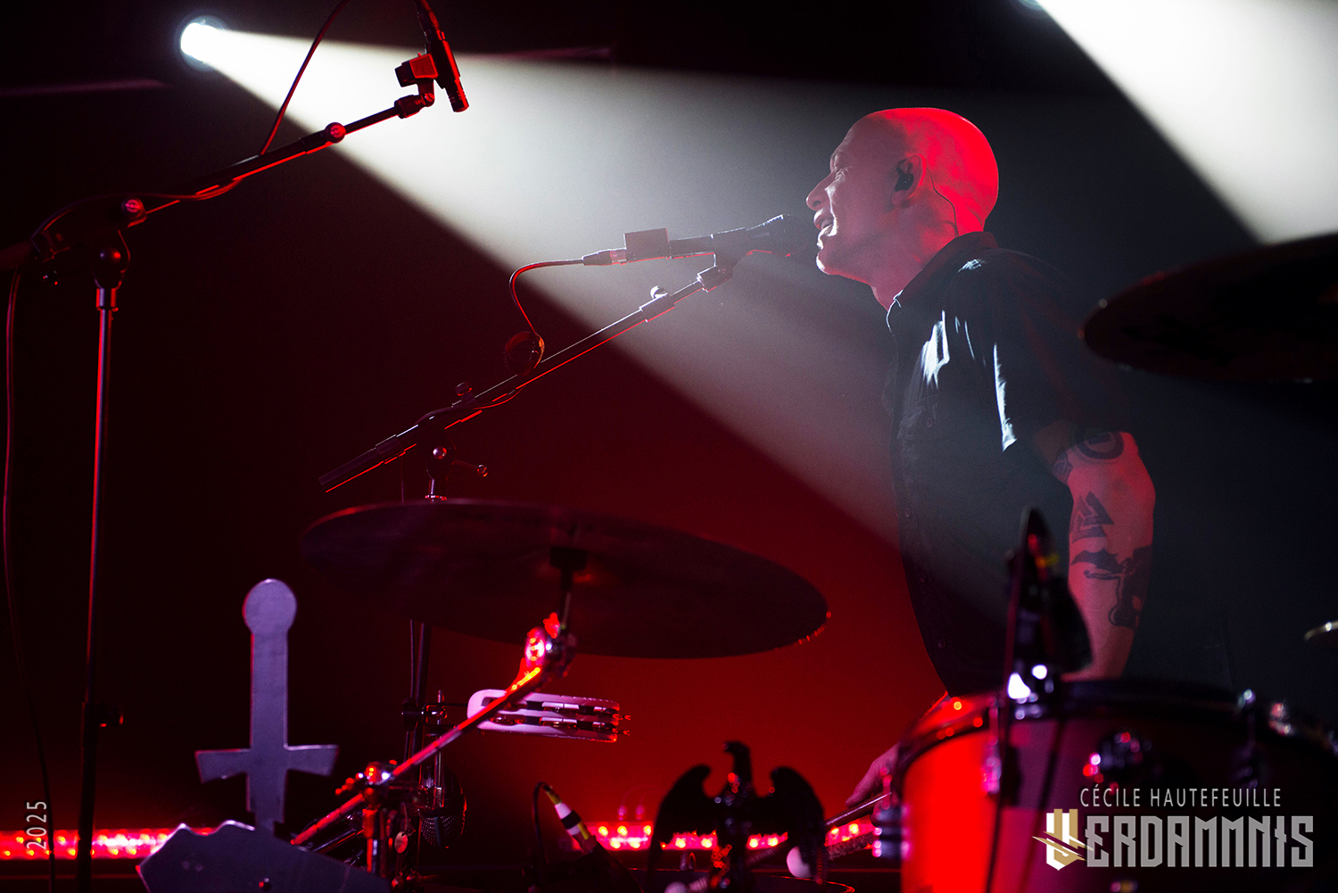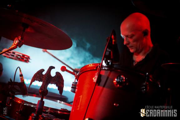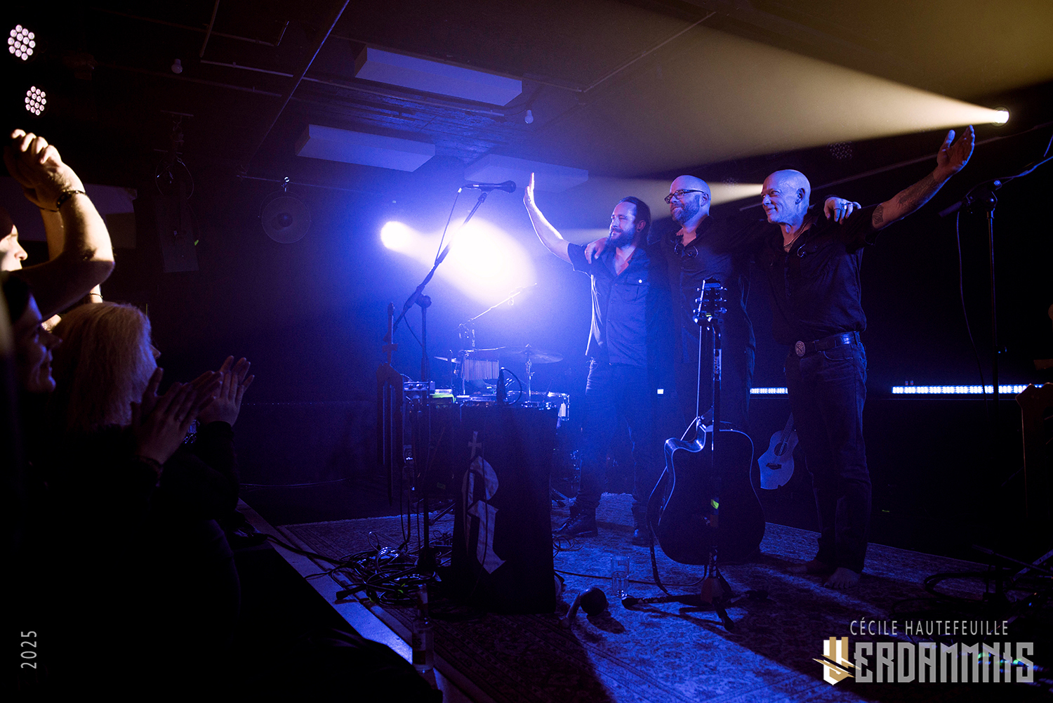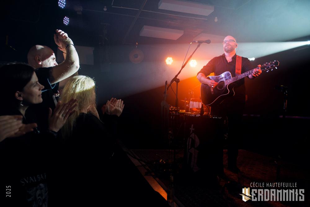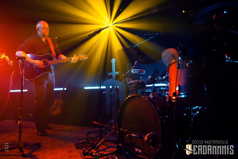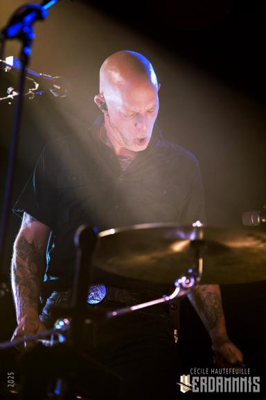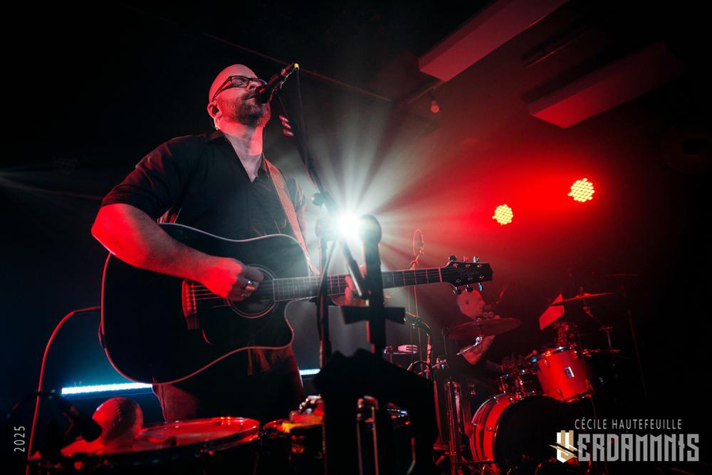 En début de rappel, Jerome Reuter revient seul sur scène pour quelques morceaux en acoustique. Étant donné le ton donné à cette tournée, on ne s'attendait évidemment pas à entendre les titres plus doux et mélancoliques de The Hyperion Machine, bien que 2025 marque également les 10 ans de l'album. Et puis pour être honnête, on avait surtout regardé la setlist skotchée sur le tom basse en début de concert. Donc on s'est un peu étouffé avec la gorgée de bière aux premières mesures de Celine in Jerusalem, il est vrai. Timidement, il s'adresse à son ingé son en français : "Je vais en faire 6. C'était prévu 5, mais finalement j'en fais 6". Il dévisage le public et continue en allemand : "le pauvre n'a aucune idée de ce que je suis en train de faire". Voilà, il aura fallu attendre le rappel pour voir poindre la première blague de la soirée. Le concert prend un tournure plus intimiste, plus légère (enfin faut pas déconner non plus, pour des gens normaux ça paraîtrait toujours totalement déprimant), et plus punchy lorsque les deux comparses de Reuter rejoignent de nouveau la scène pour "le grand final", annoncé avec humour. Le public ne cesse d'en redemander, et ROME s'exécute. Finalement, Jerome entame Swords to Rust avec un petit rire en coin et l'air de nous avoir fait une faveur : "On en a encore une dernière.... mais après c'est fini hein!" et le rappel du public pendant de longues minutes ensuite n'y fera rien. C'était vraiment fini, et c'était vraiment trop bien.