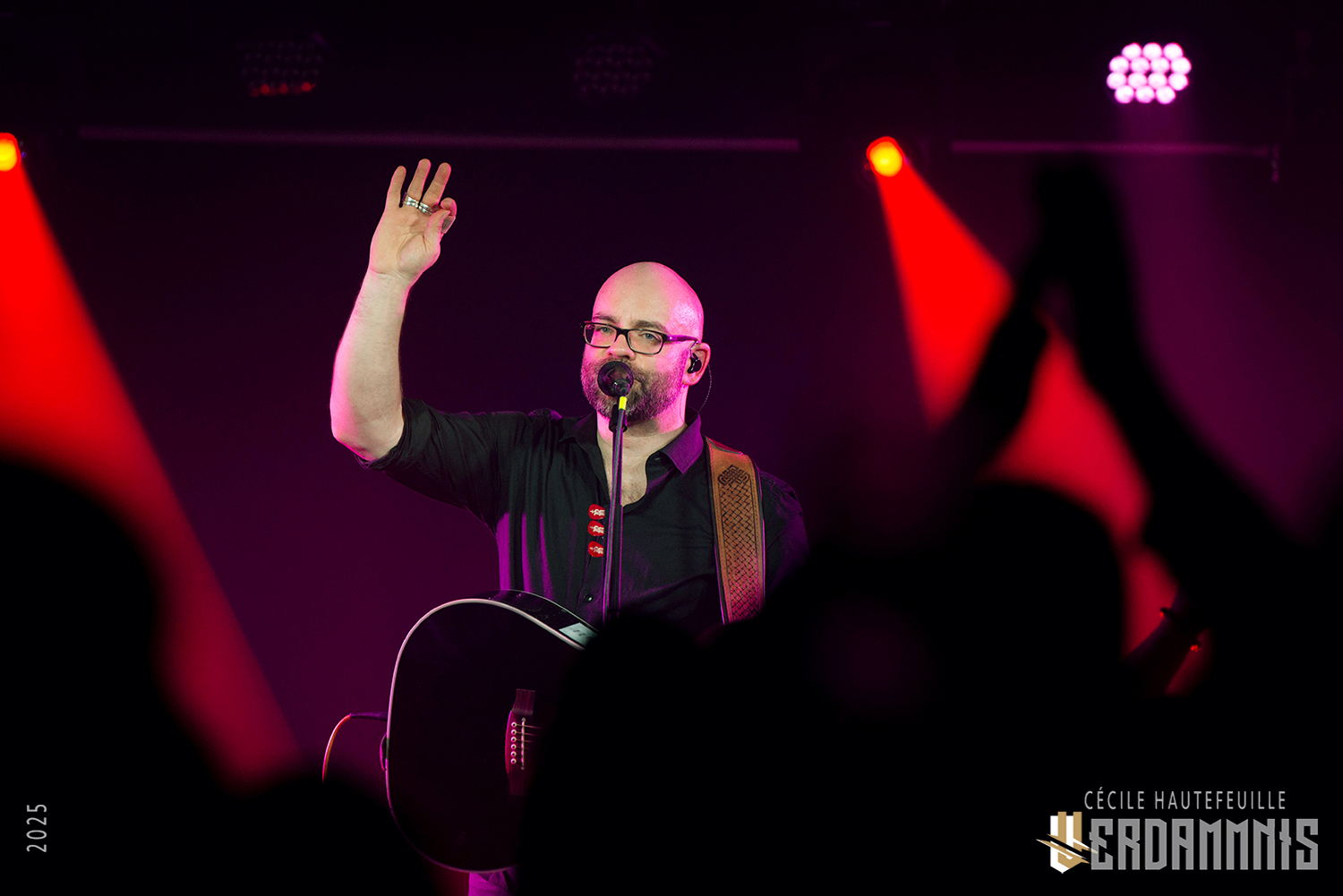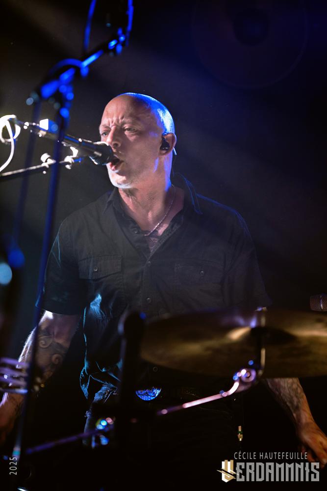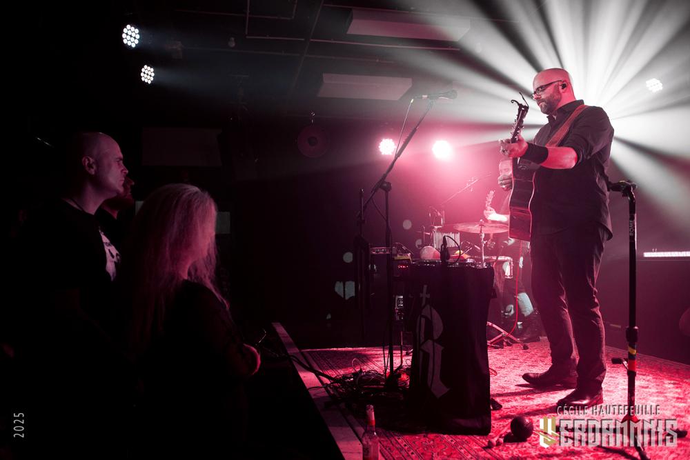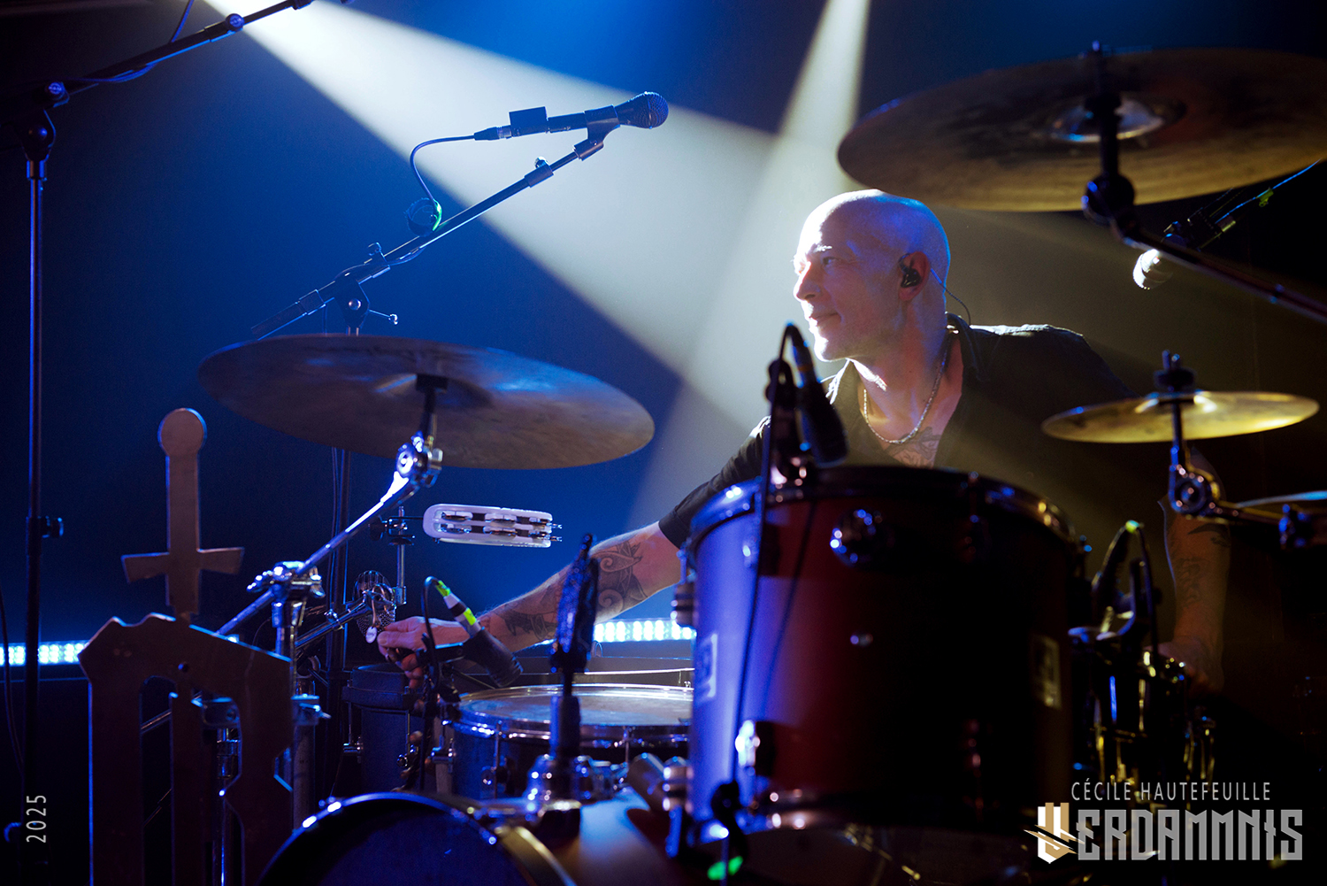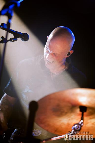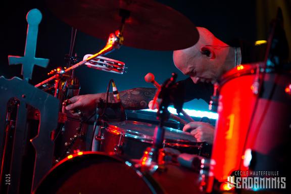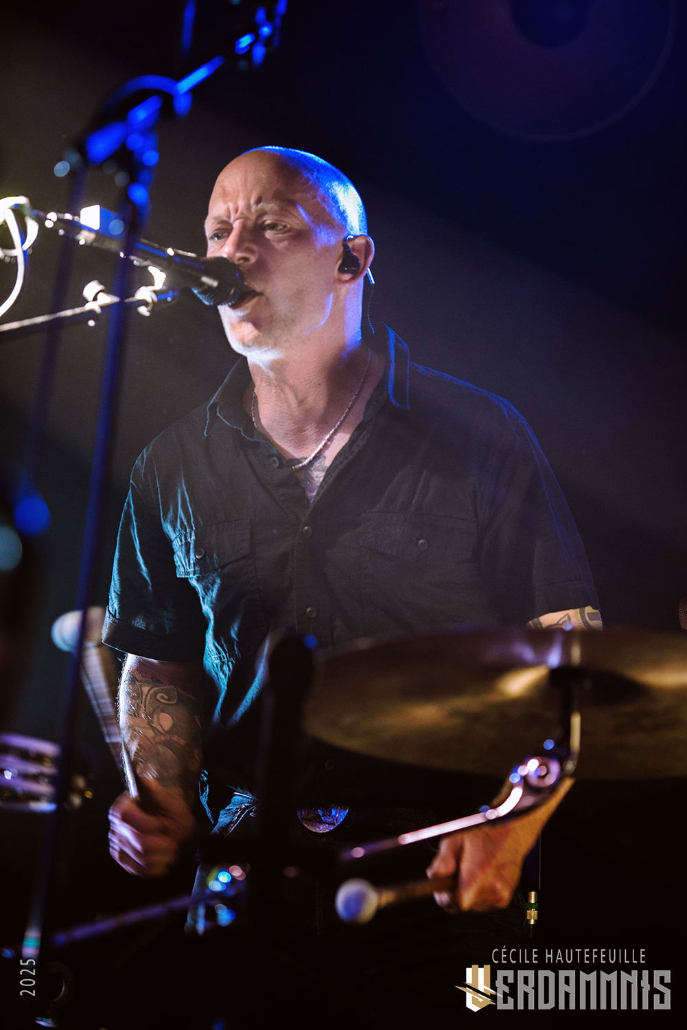 En début de rappel, Jerome Reuter revient seul sur scène pour quelques morceaux en acoustique. Étant donné le ton donné à cette tournée, on ne s'attendait évidemment pas à entendre les titres plus doux et mélancoliques de The Hyperion Machine, bien que 2025 marque également les 10 ans de l'album. Et puis pour être honnête, on avait surtout regardé la setlist skotchée sur le tom basse en début de concert. Donc on s'est un peu étouffé avec la gorgée de bière aux premières mesures de Celine in Jerusalem, il est vrai. Timidement, il s'adresse à son ingé son en français : "Je vais en faire 6. C'était prévu 5, mais finalement j'en fais 6". Il dévisage le public et continue en allemand : "le pauvre n'a aucune idée de ce que je suis en train de faire". Voilà, il aura fallu attendre le rappel pour voir poindre la première blague de la soirée. Le concert prend un tournure plus intimiste, plus légère (enfin faut pas déconner non plus, pour des gens normaux ça paraîtrait toujours totalement déprimant), et plus punchy lorsque les deux comparses de Reuter rejoignent de nouveau la scène pour "le grand final", annoncé avec humour. Le public ne cesse d'en redemander, et ROME s'exécute. Finalement, Jerome entame Swords to Rust avec un petit rire en coin et l'air de nous avoir fait une faveur : "On en a encore une dernière.... mais après c'est fini hein!" et le rappel du public pendant de longues minutes ensuite n'y fera rien. C'était vraiment fini, et c'était vraiment trop bien.