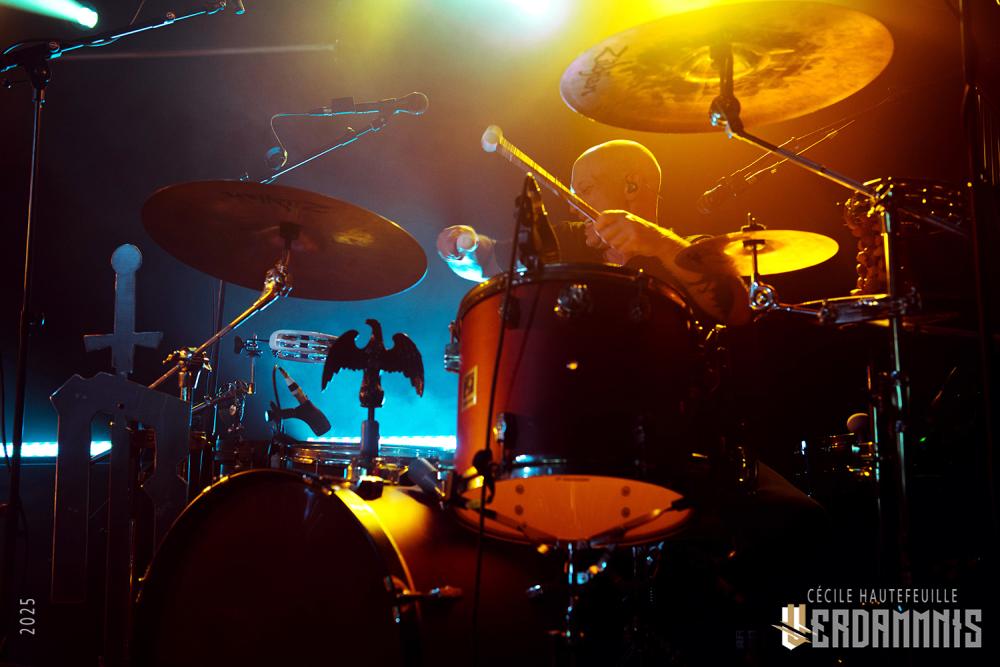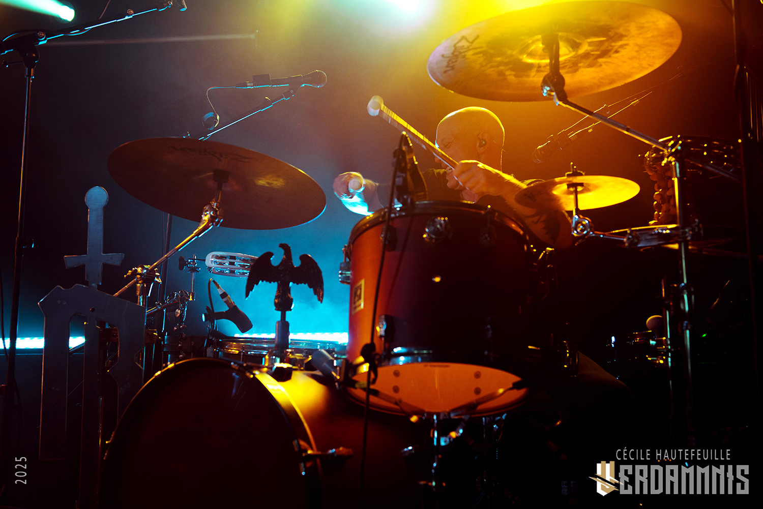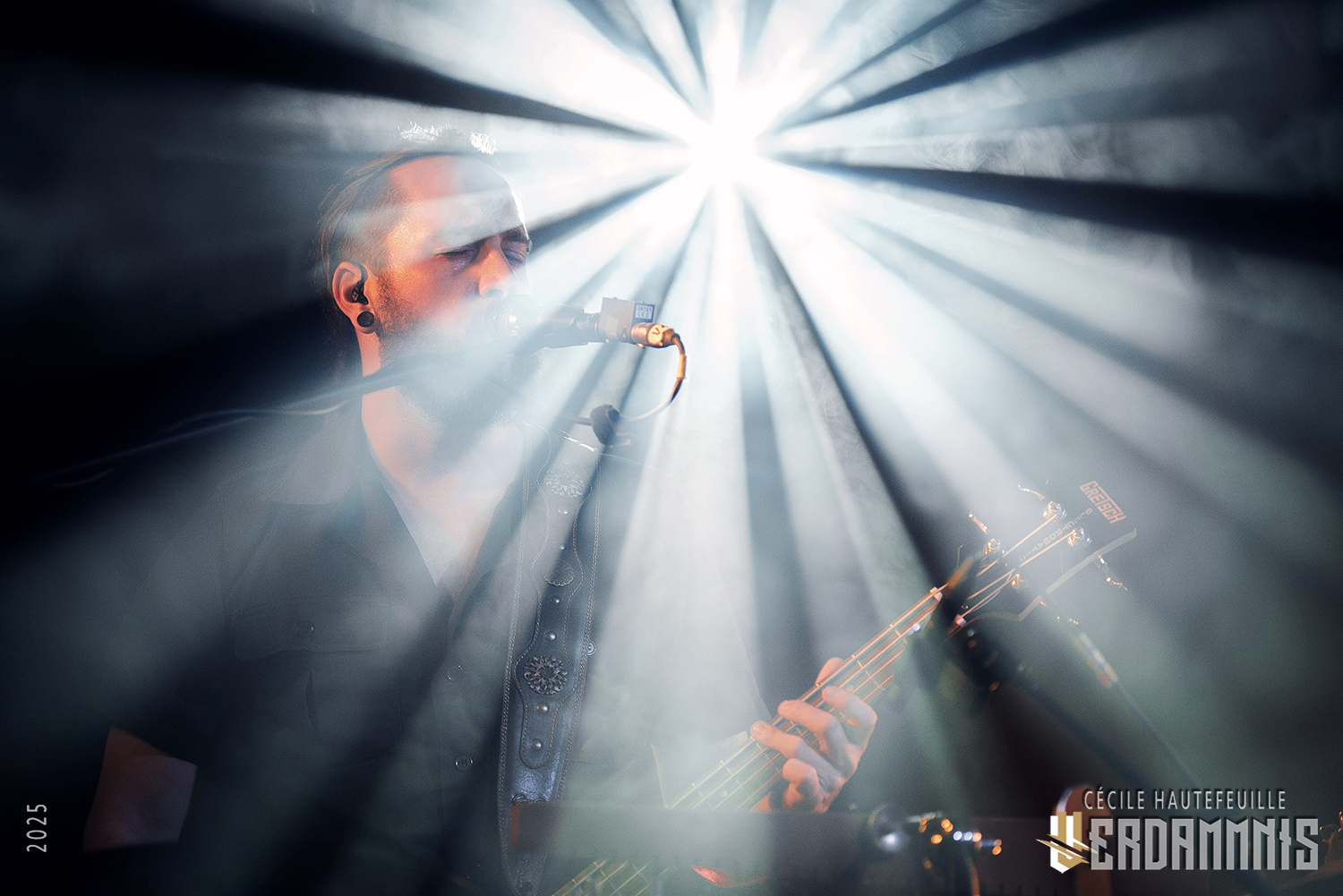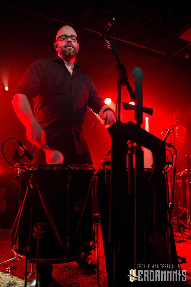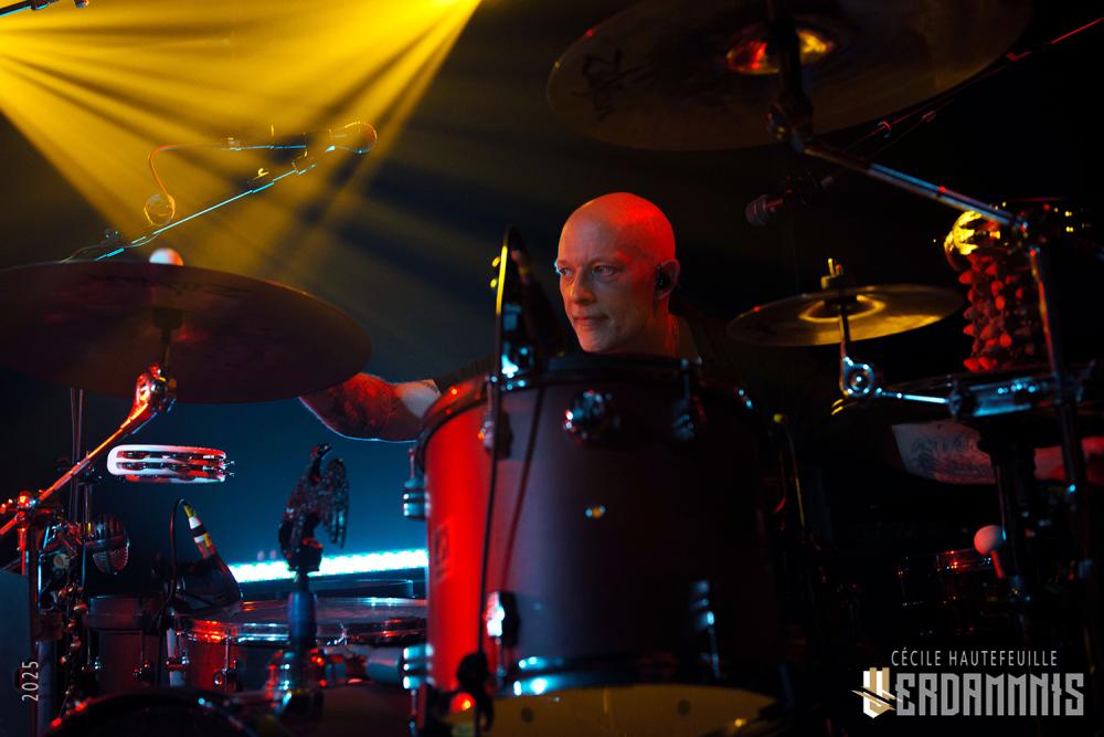 En début de rappel, Jerome Reuter revient seul sur scène pour quelques morceaux en acoustique. Étant donné le ton donné à cette tournée, on ne s'attendait évidemment pas à entendre les titres plus doux et mélancoliques de The Hyperion Machine, bien que 2025 marque également les 10 ans de l'album. Et puis pour être honnête, on avait surtout regardé la setlist skotchée sur le tom basse en début de concert. Donc on s'est un peu étouffé avec la gorgée de bière aux premières mesures de Celine in Jerusalem, il est vrai. Timidement, il s'adresse à son ingé son en français : "Je vais en faire 6. C'était prévu 5, mais finalement j'en fais 6". Il dévisage le public et continue en allemand : "le pauvre n'a aucune idée de ce que je suis en train de faire". Voilà, il aura fallu attendre le rappel pour voir poindre la première blague de la soirée. Le concert prend un tournure plus intimiste, plus légère (enfin faut pas déconner non plus, pour des gens normaux ça paraîtrait toujours totalement déprimant), et plus punchy lorsque les deux comparses de Reuter rejoignent de nouveau la scène pour "le grand final", annoncé avec humour. Le public ne cesse d'en redemander, et ROME s'exécute. Finalement, Jerome entame Swords to Rust avec un petit rire en coin et l'air de nous avoir fait une faveur : "On en a encore une dernière.... mais après c'est fini hein!" et le rappel du public pendant de longues minutes ensuite n'y fera rien. C'était vraiment fini, et c'était vraiment trop bien.