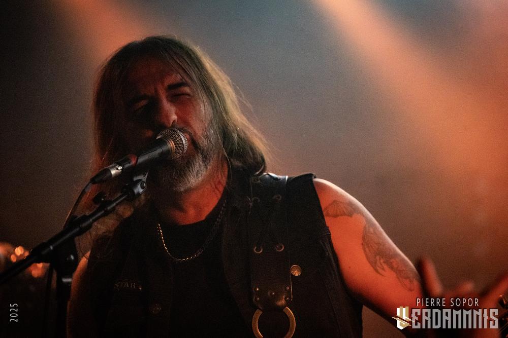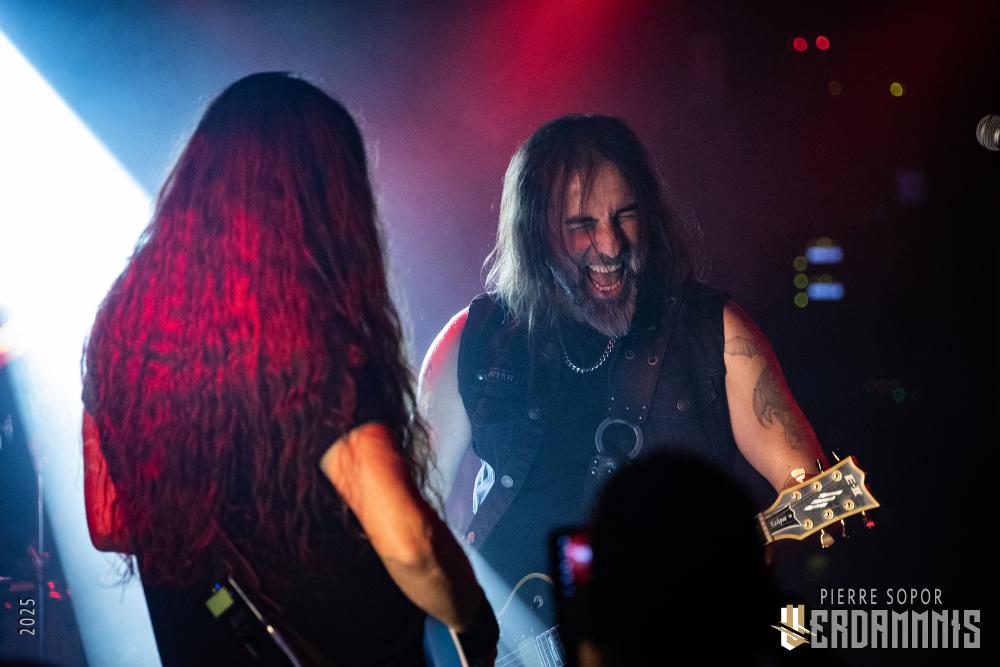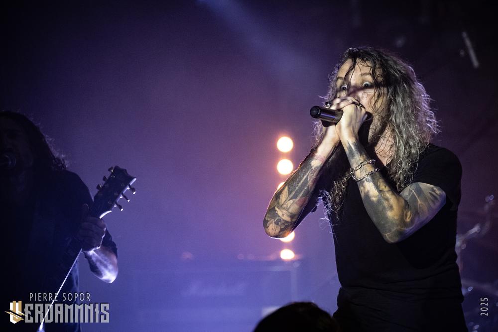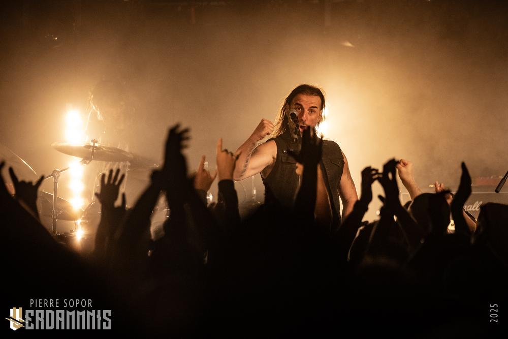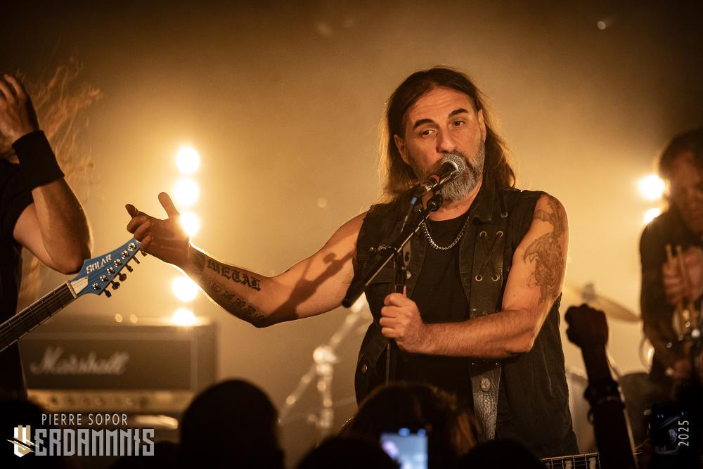 A little less than an hour ago, we thought we could hear clues about the upcoming concert in the music playing in the venue. So we weren't quite sure what to think when we heard an old french singer, Michel Polnareff, filling in during the break... Fortunately, when the star of the evening took to the stage, it wasn't to reel us in with French chanson standards. With his usual enthusiasm, he treated the Parisian audience to songs from his solo repertoire, a mix of all the influences that have inspired his career, from heavy metal to extreme metal. We were delighted to hear him include a track from The Seven Seals of the Apocalypse, Seal 3-(Revelation 6:5-6) -The Black Horse, whose dark mystical incantations and martial rhythms are most effective. Sakis Tolis is an outstanding charismatic leader, and he proves it once again in a role halfway between an ancient tyrant and the leader of a band of friends whom we follow on all his adventures. The audience reacts immediately. It is surprising to see how songs like My Salvation, The Dawn of a New Age and We the Fallen Angels already seem to be cult classics for an audience that knows the lyrics by heart.