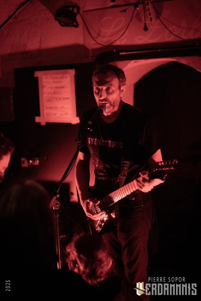 La Funèbre Nuit... on commence à comprendre qu'on ne va pas (que) rigoler. C'est au tour de Roro Perrot de prendre place sous les caillasses du Zorba. Roro Perrot, alias Vomir, alias Ennui, alias Meurs, alias Romprai Etron, alias Trou aux Rats, alias True Aura... alias Veuglaire. Un paquet de noms tous aussi cools les uns que les autres pour désigner ce drôle de type qui se pointe, fait un bruit bizarre avec sa guitare pour marquer le début du concert et, l'air déjà saoulé par lui-même, dit "bon bah voilà, c'est noise, hein". C'était peut-être le premier morceau, ou juste un moyen de vérifier que l'ampli était branché, allez savoir. Puis c'est reparti pour un jeu de textures chaotiques qui réussirait presque à faire sourire Lionel Jospin ou à faire pousser des cheveux au sommet de Vin Diesel. C'est à la fois hypnotique et dégueulasse, et, comme un bébé à deux têtes molles et humides de bave qui ferait de l'aérobic, repoussant et étrangement fascinant. "Ah putain, j'étais mal accordé, désolé, je vais la refaire" dit-il au bout de deux ou trois minutes de massacre avant de refaire la même chose. Ou un truc vaguement différent, on ne sait pas trop et tout le monde s'en fout. Puis il se met à gueuler des trucs inarticulés.