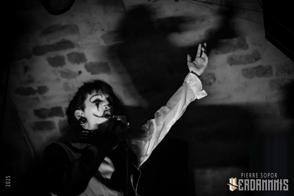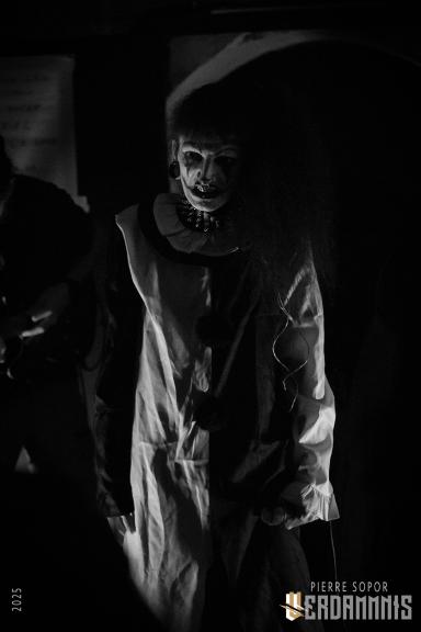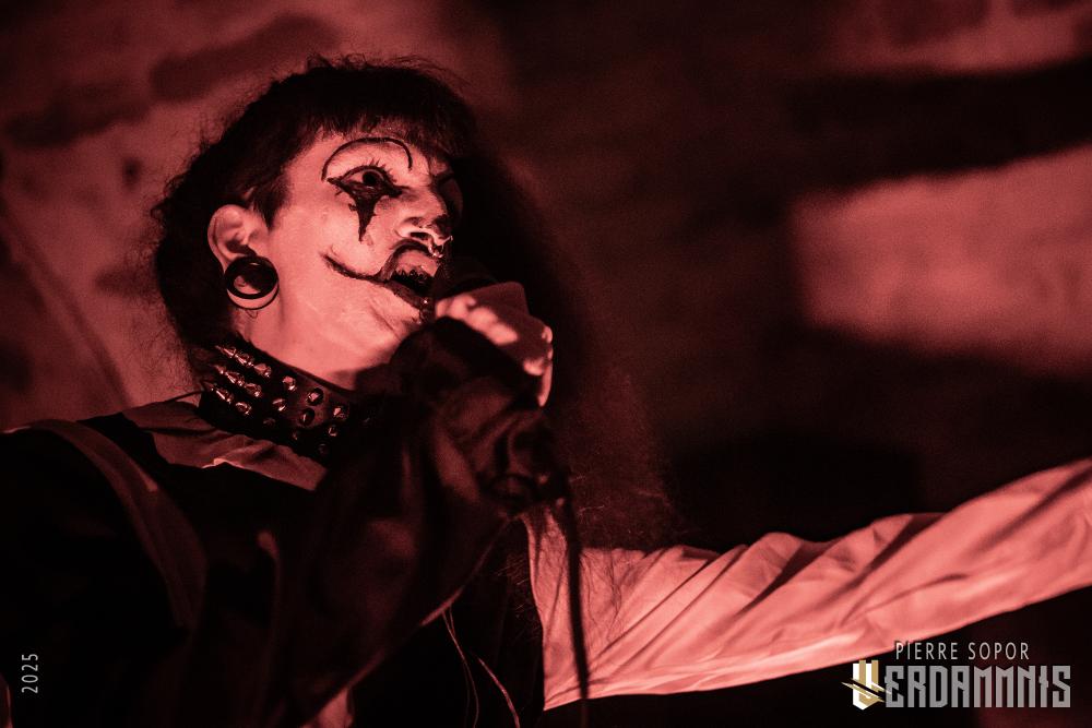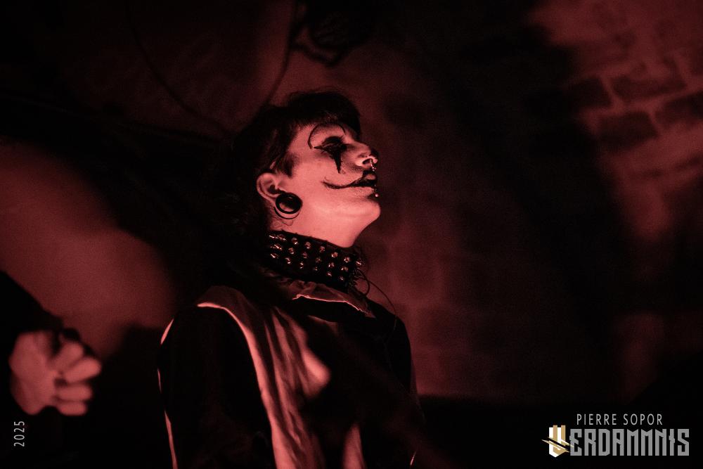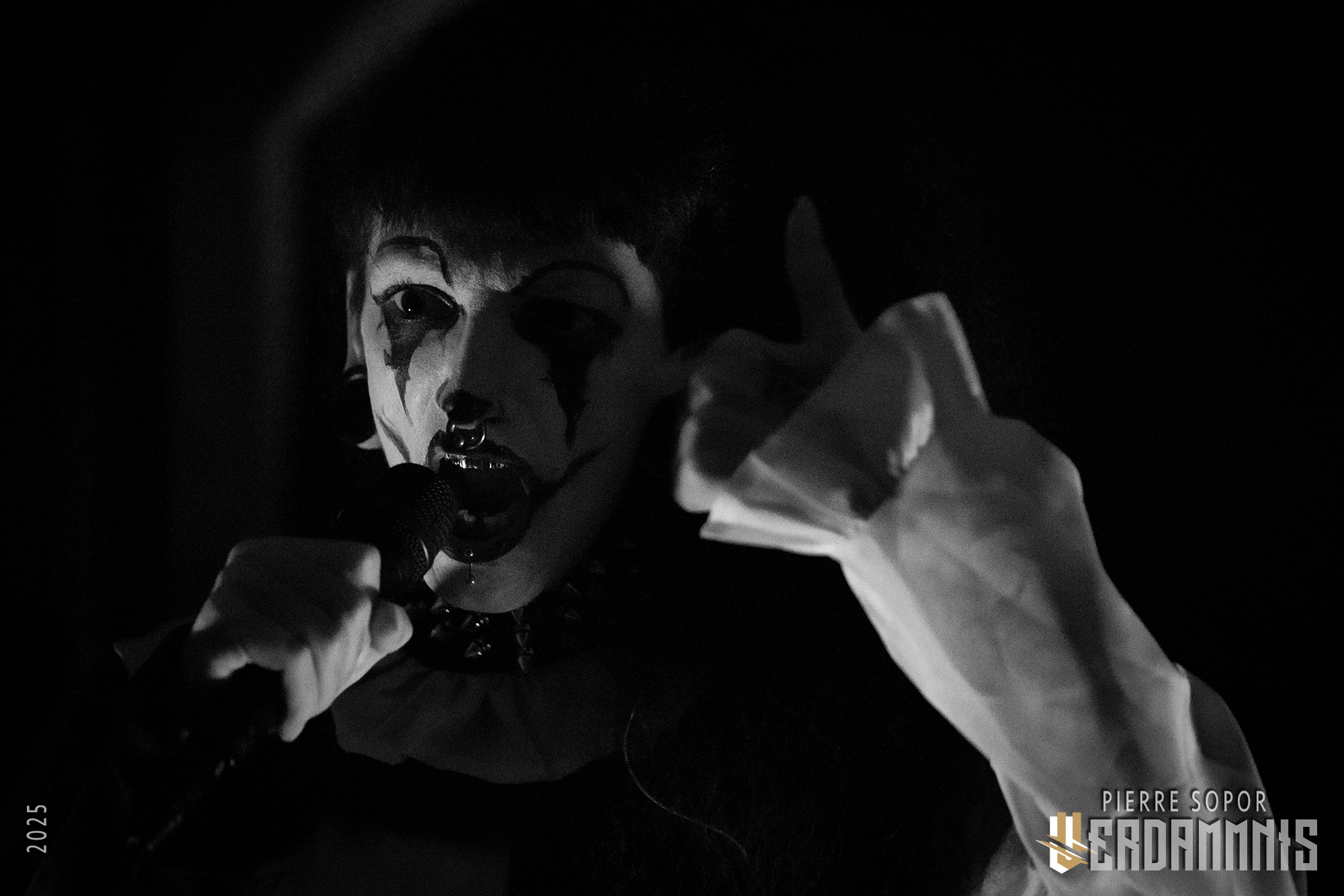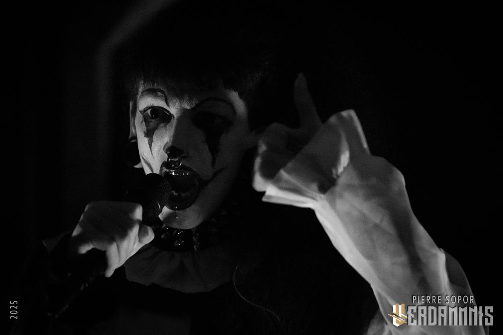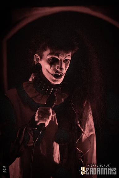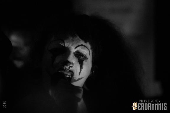 Depuis une dizaine d'années, Willow alias WLWD mène Worhs en y injectant toute son âme, sans compromis, sans postures artificielles. Elle arrive sur scène dans un costume de pierrot, de clown triste... ou d'Art, le clown de Terrifier (sa masse de cheveux sur le côté nous rappelle d'ailleurs la petite fille démoniaque, meilleur personnage de la célèbre saga de slasher gores !). Ce soir, elle est accompagné de Maëlle, du projet de black metal industriel Cross Contact. Les ténèbres riment avec funèbre, elle a un petit klaxon pour faire pouêt-pouêt, yes, on va bien rigoler !