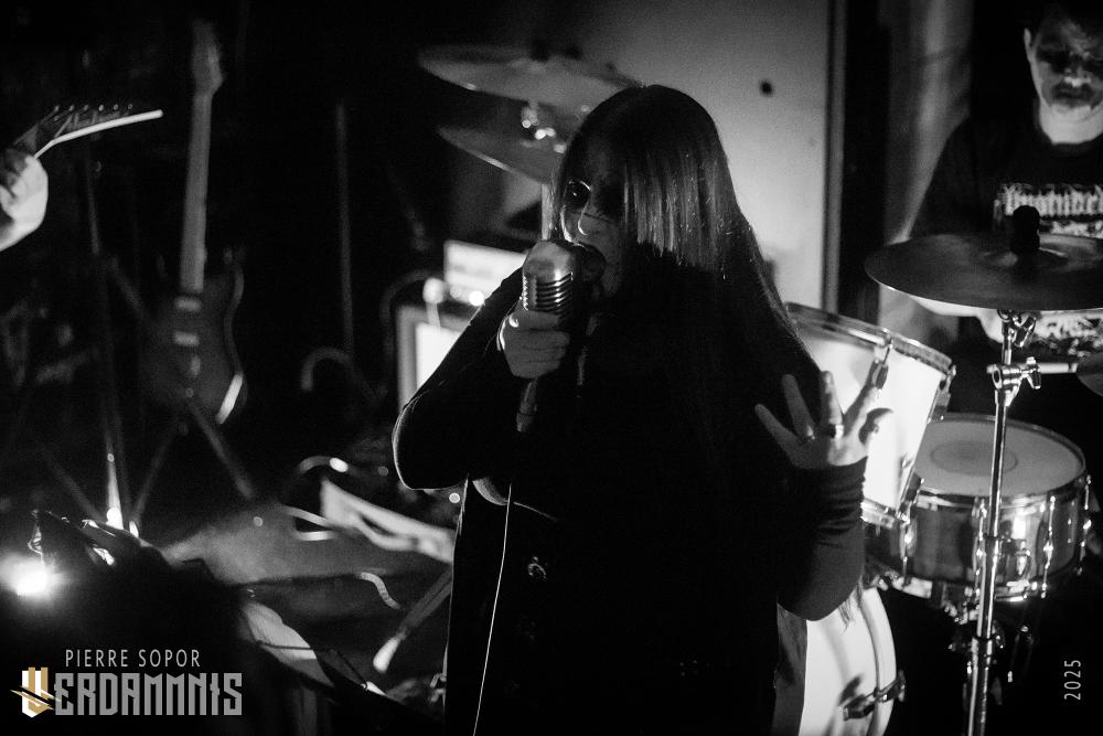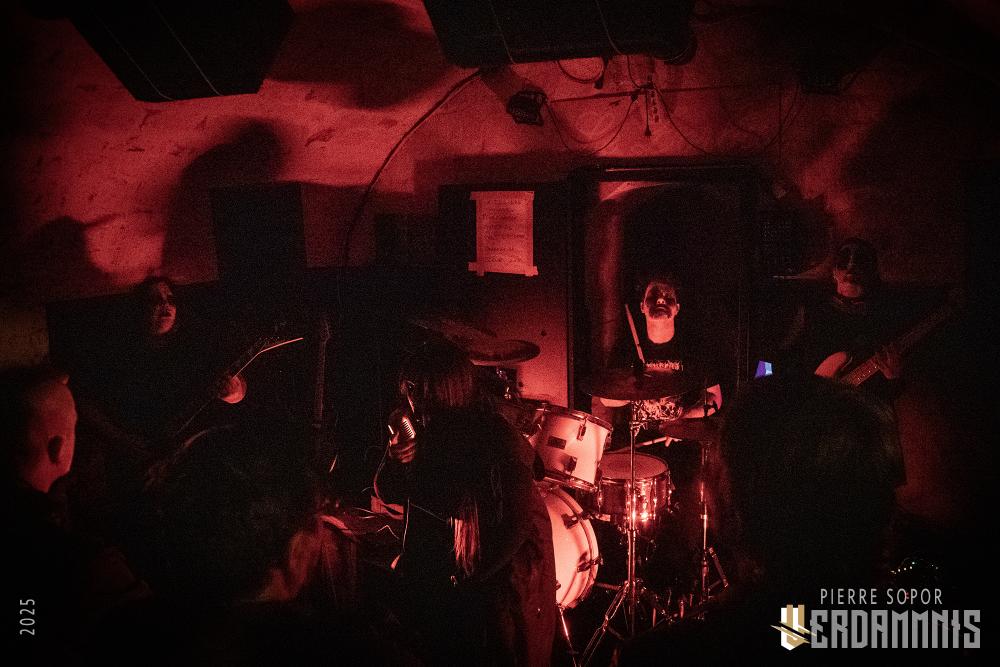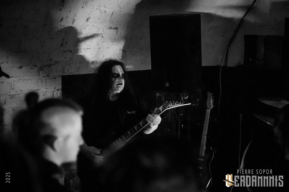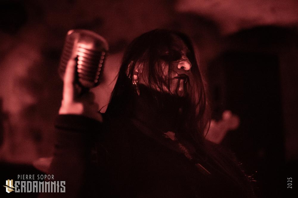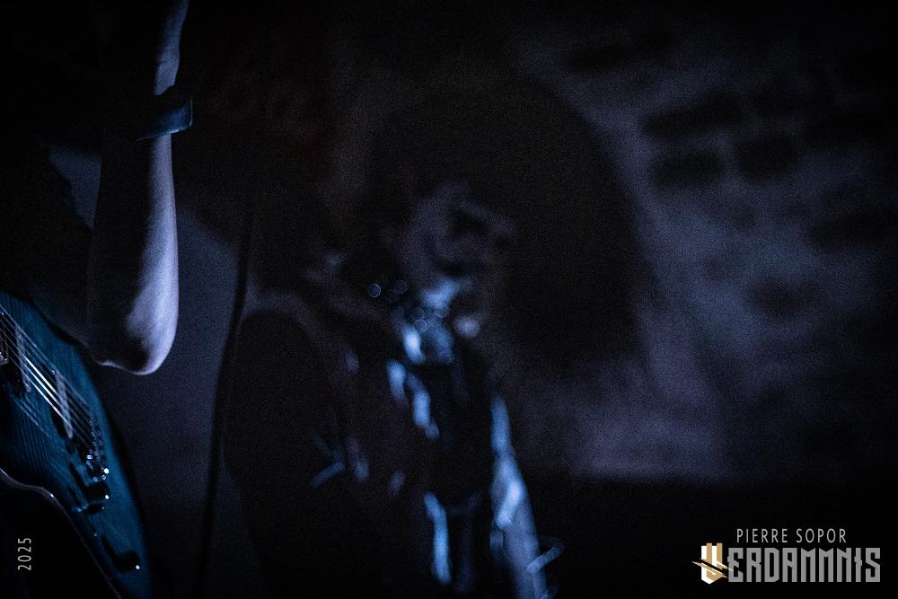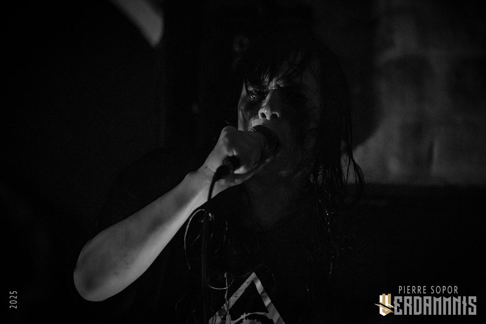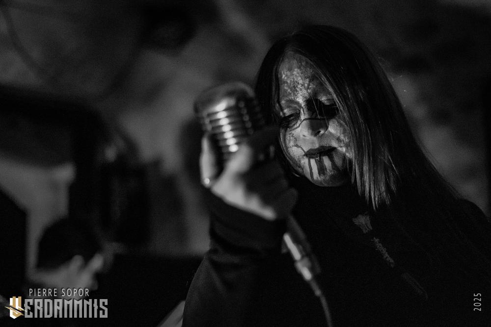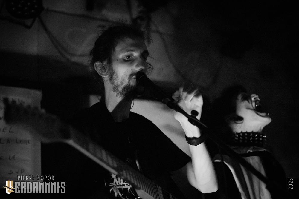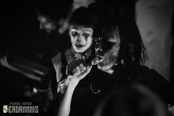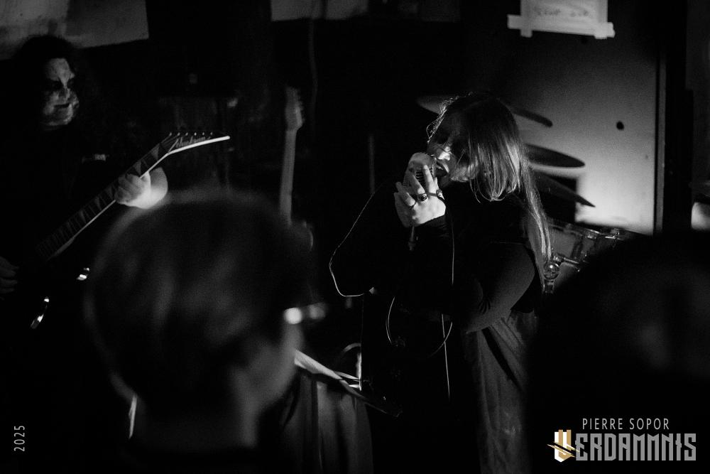 On est dans une sorte de trou, c'est humide, ça sent le caveau et la pisse, on va voir Douve : tout semble s'aligner avec une logique implacable. Chez Douve, on retrouve au chant Asphodel, également voix de Mortis Mutilati, Chloé à la guitare (ex-Mortis Mutilati, ex-Moonreich), Eva-Lou à la basse et Atc à la batterie : même si le groupe fête la sortie de son premier album, les filles (et le garçon) derrière ont de l'expérience. Douve existe d'ailleurs depuis plusieurs années, ce qui explique probablement la foule qui s'entasse. Y'en a qui ne peuvent pas rentrer et doivent alors écouter le concert depuis les escaliers, dans le délicat bouquet des lieux... c'est très metal !